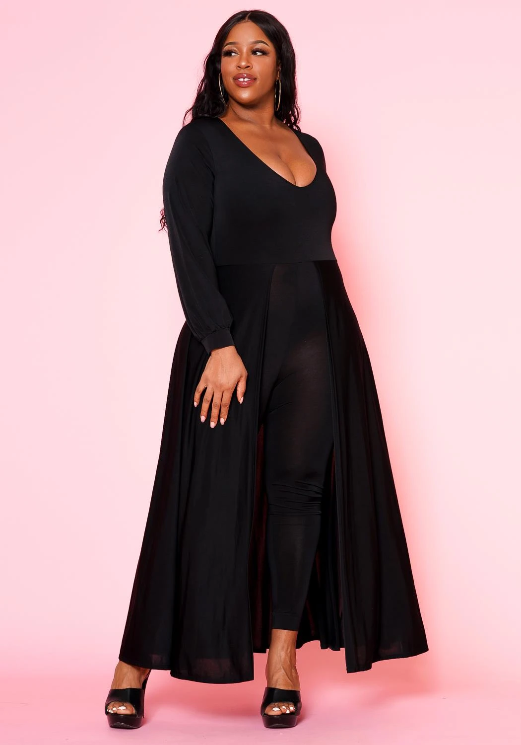 Plus size women’s scoop neck long sleeve jumpsuit with long caped skirt.