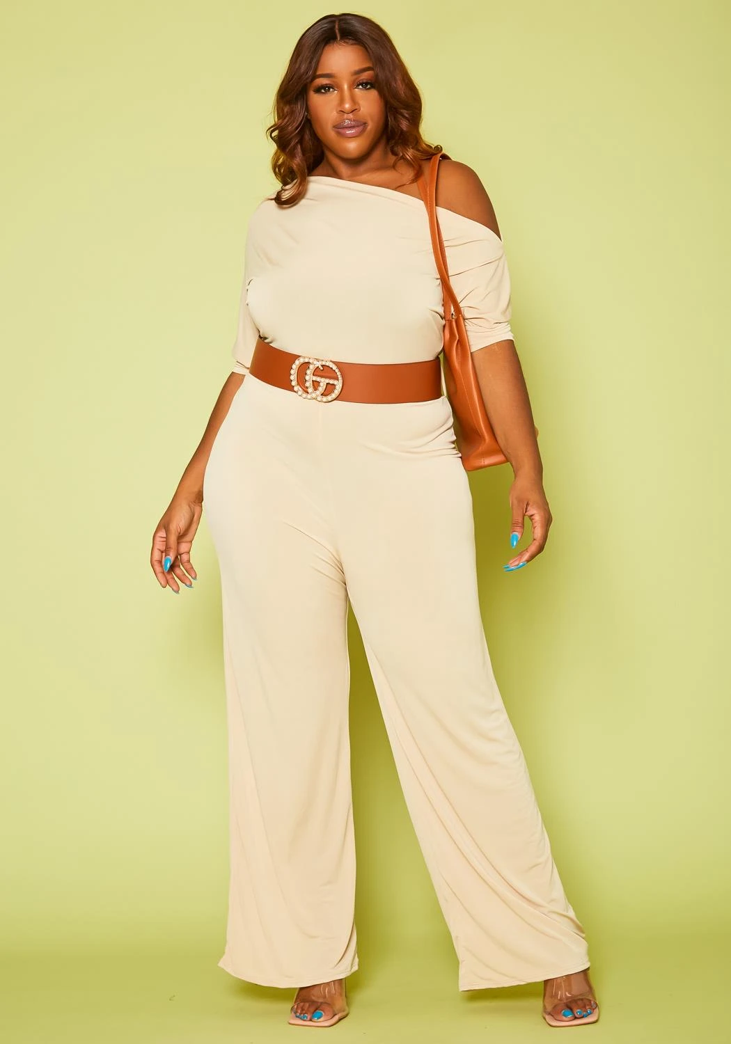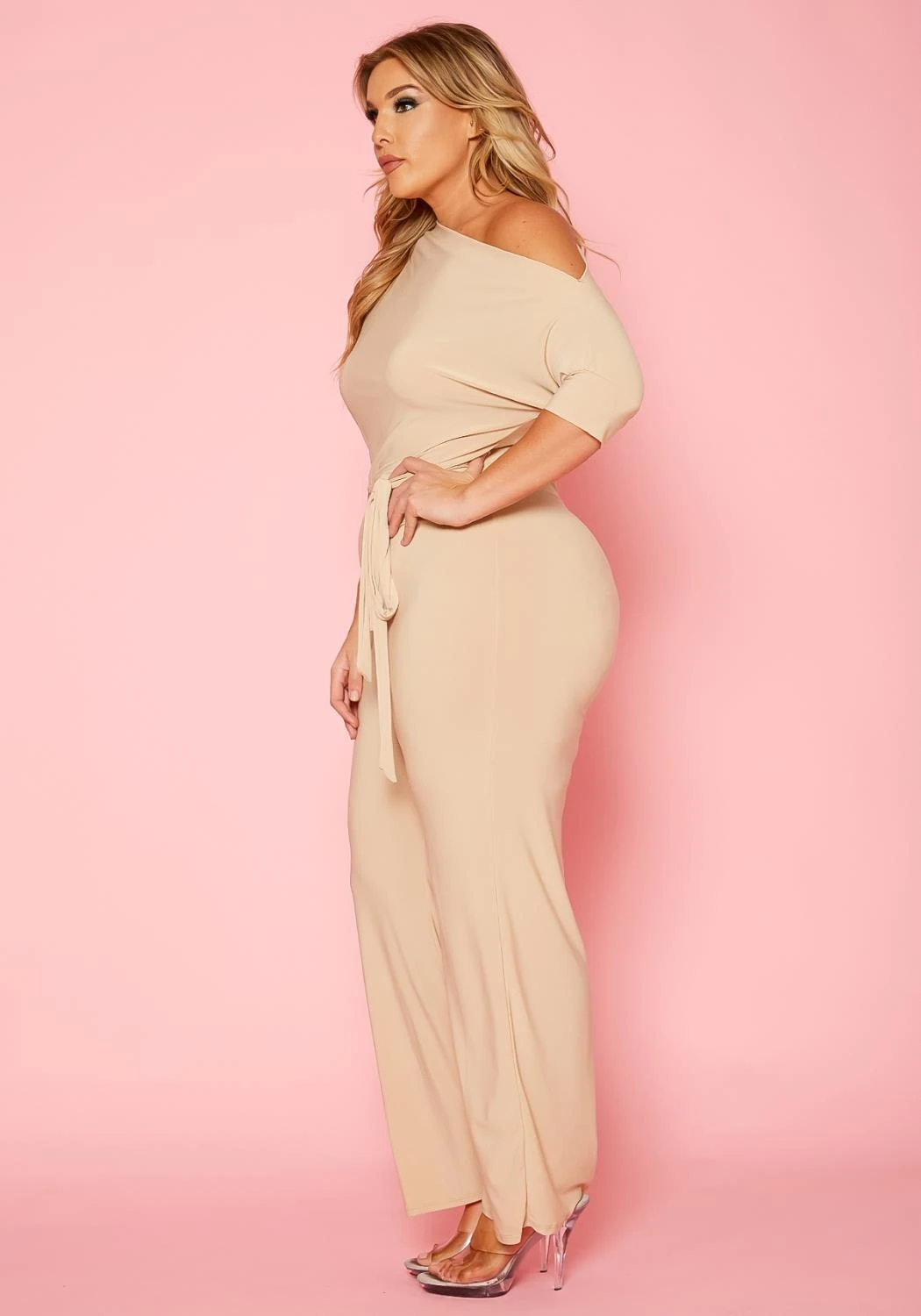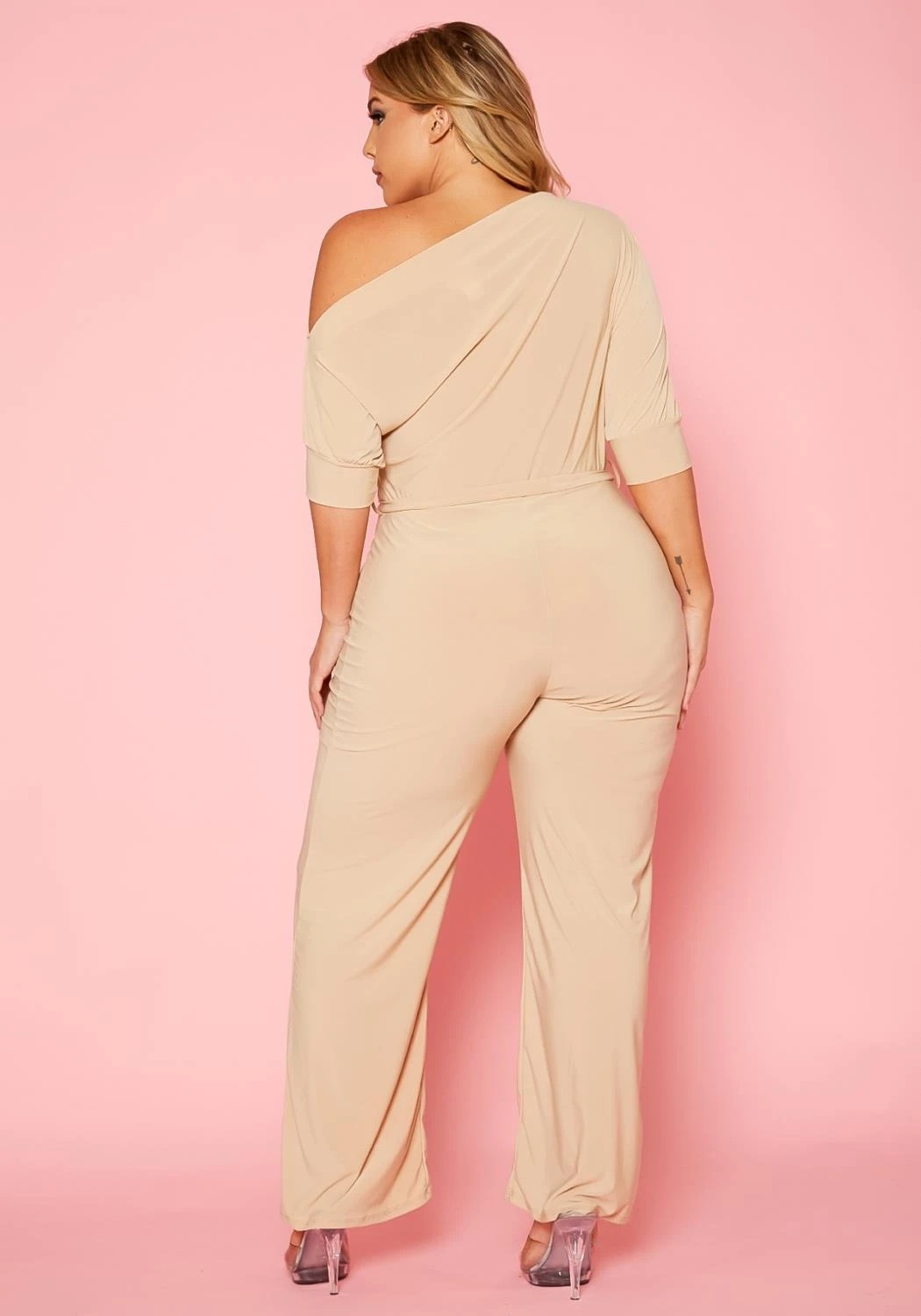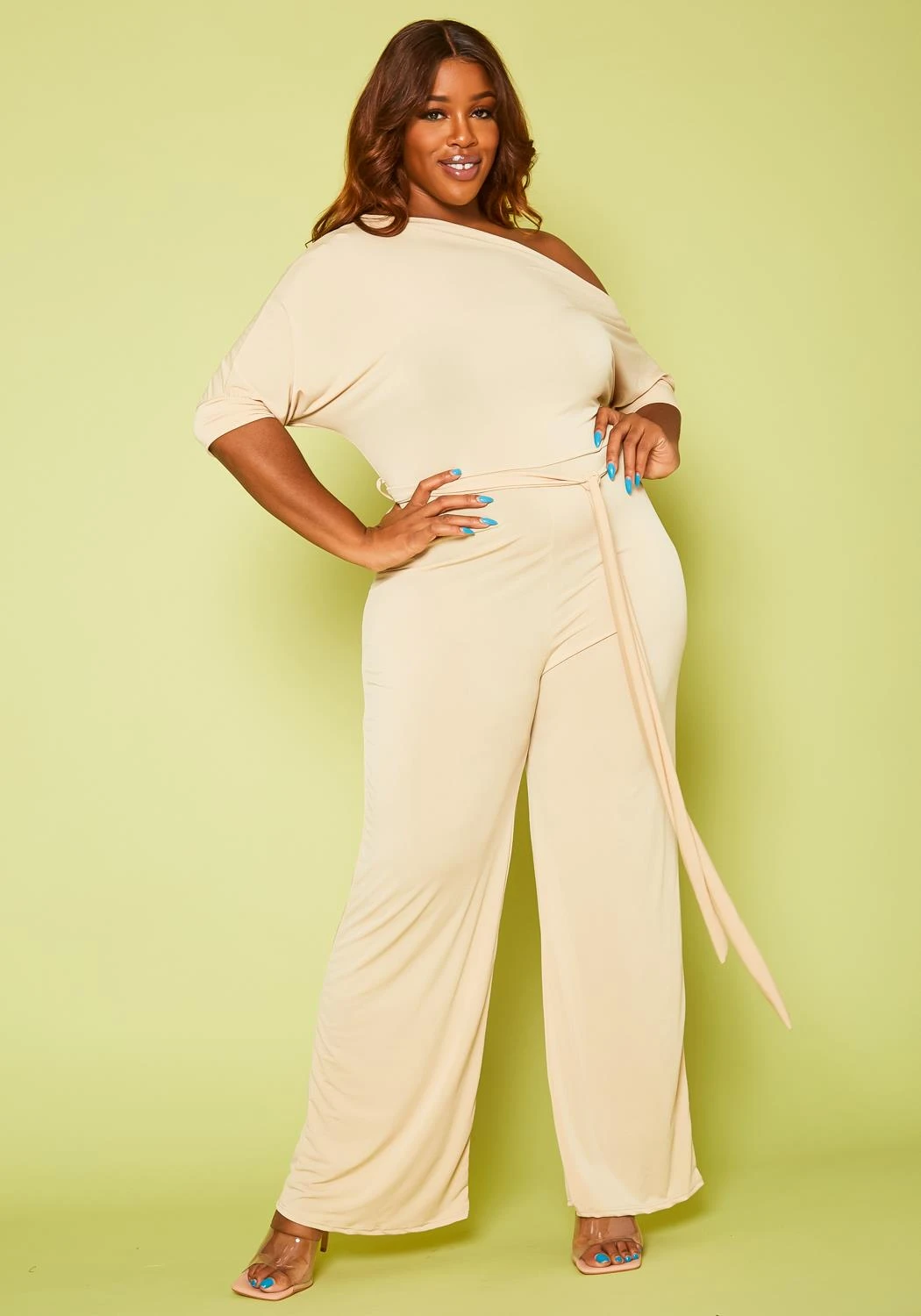 Walk in style with the gorgeous plus size women’s jumpsuit in cold shoulder design and straight leg fit! Features a waist tie ascent and half shoulder sleeves.