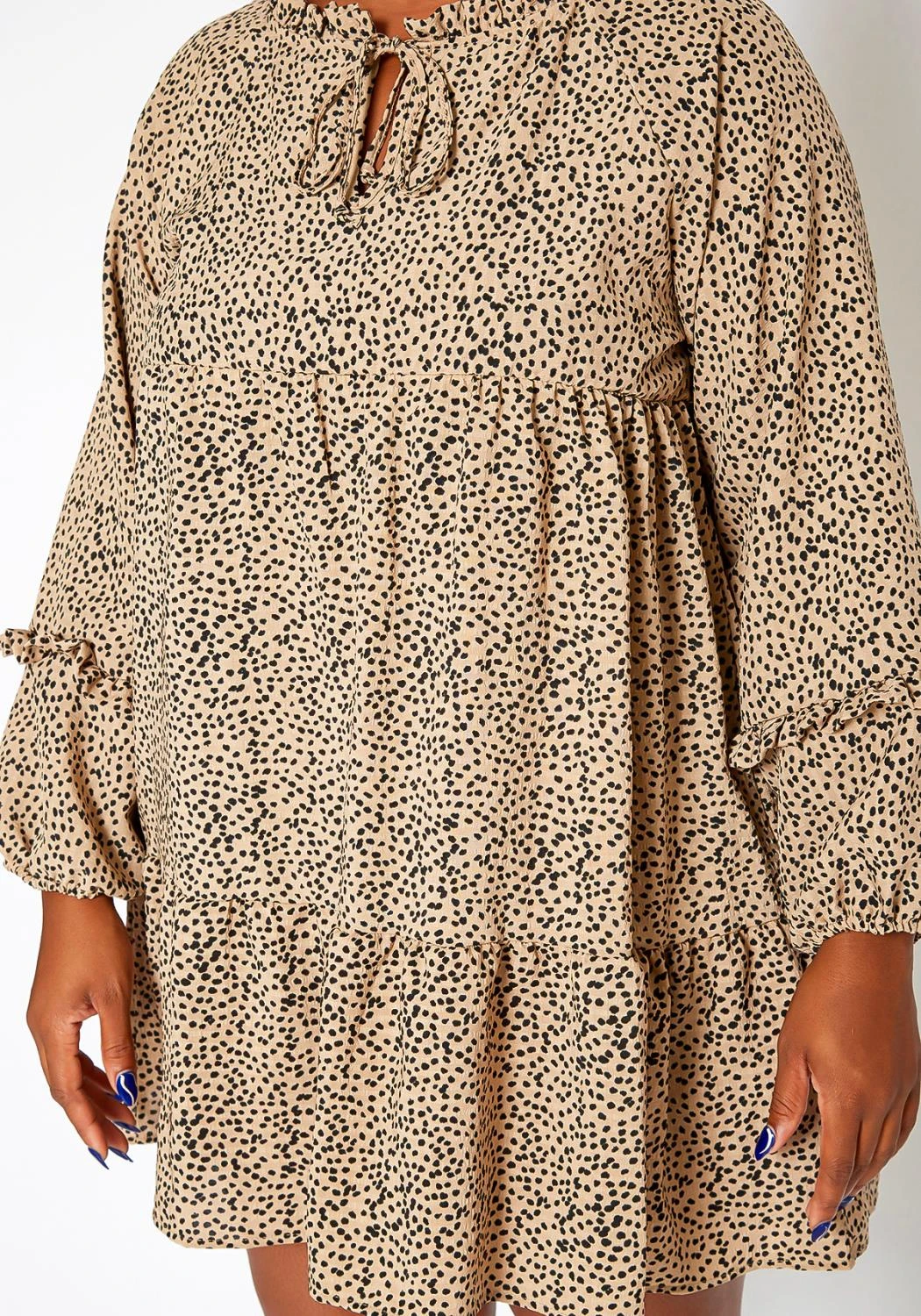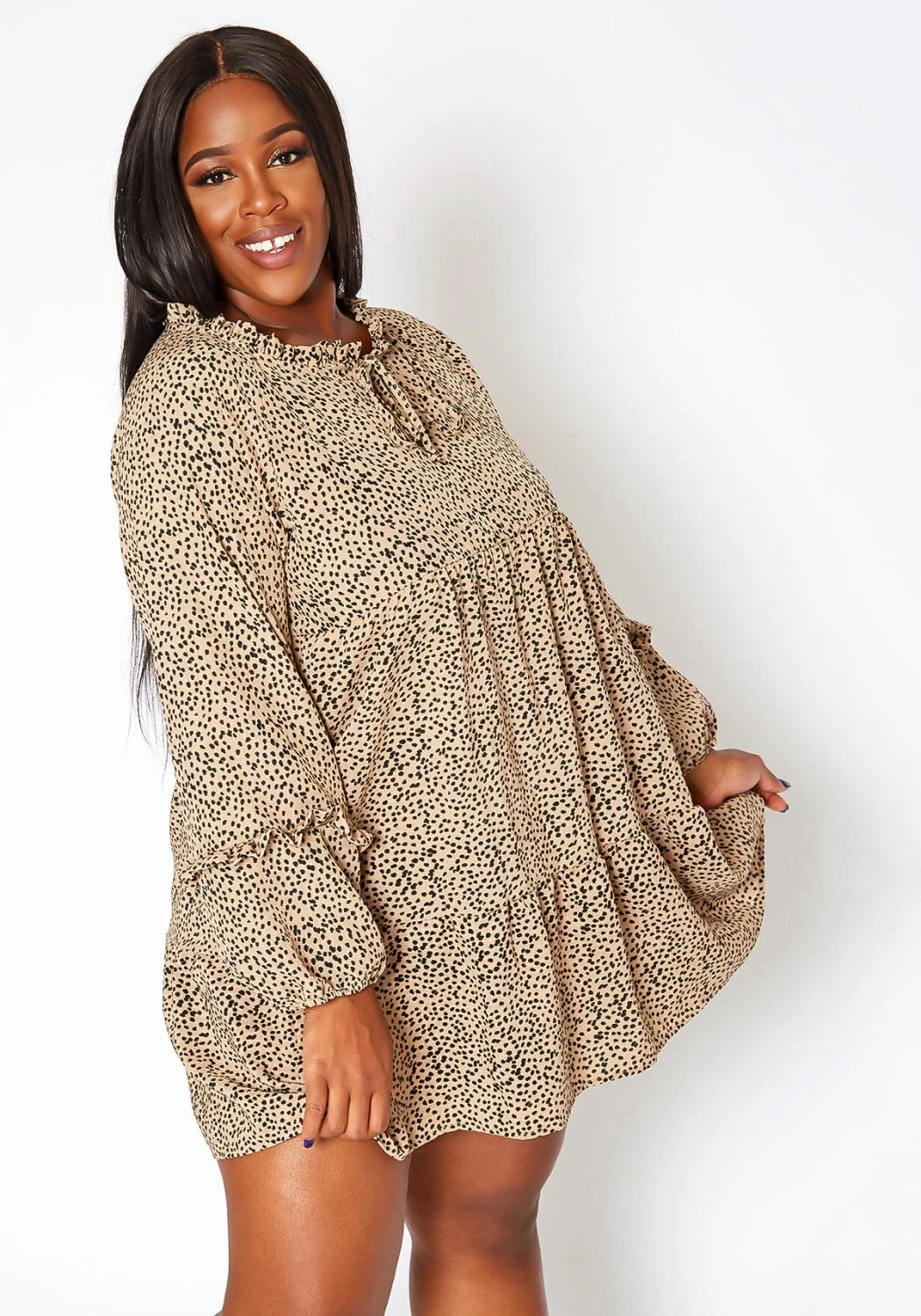 Pretty fit & flare mini dress for plus size women in dotted print, long sleeves, ruffle trim and tie-front neck detail.