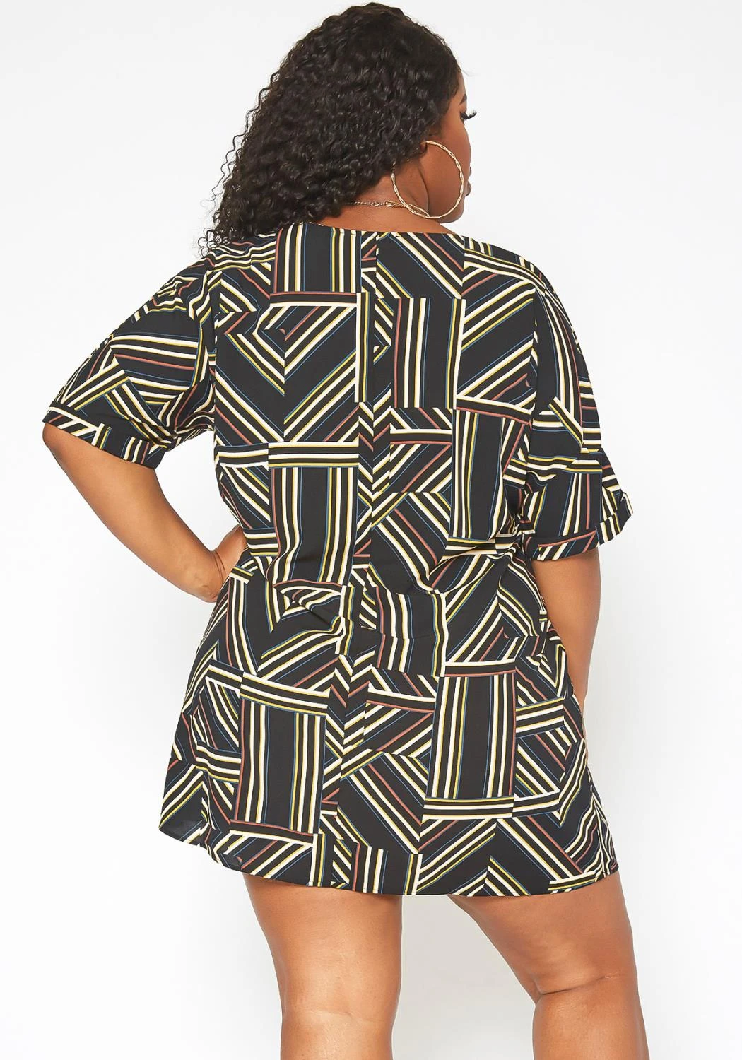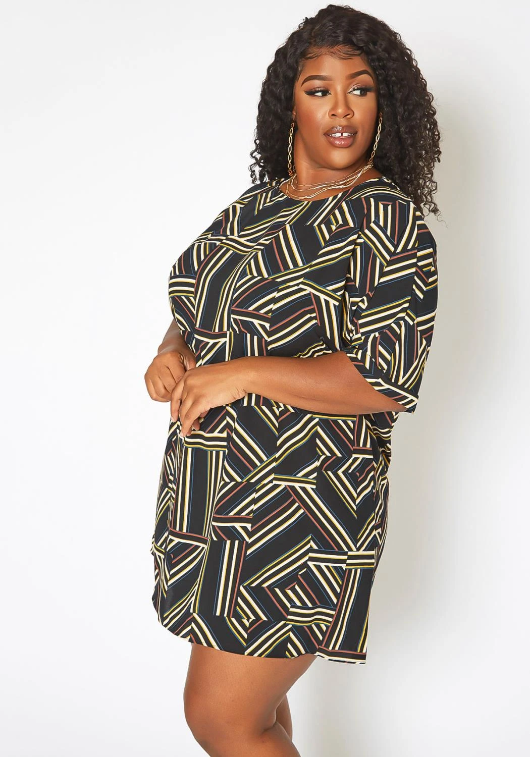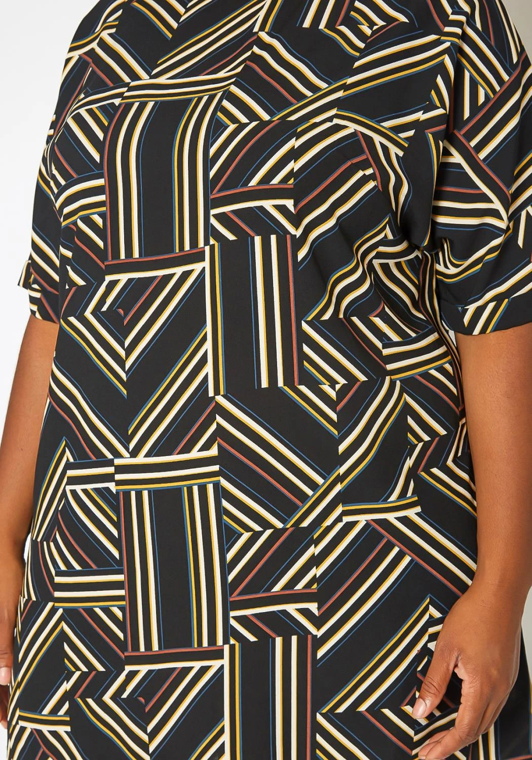Relaxed fit plus size women’s t-shirt mini dress in short sleeves, geometrical striped print and round neck style.