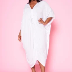 Plus size women’s V-Neck oversized loosely fitted midi dress with ruched detailing and batwing short sleeves.