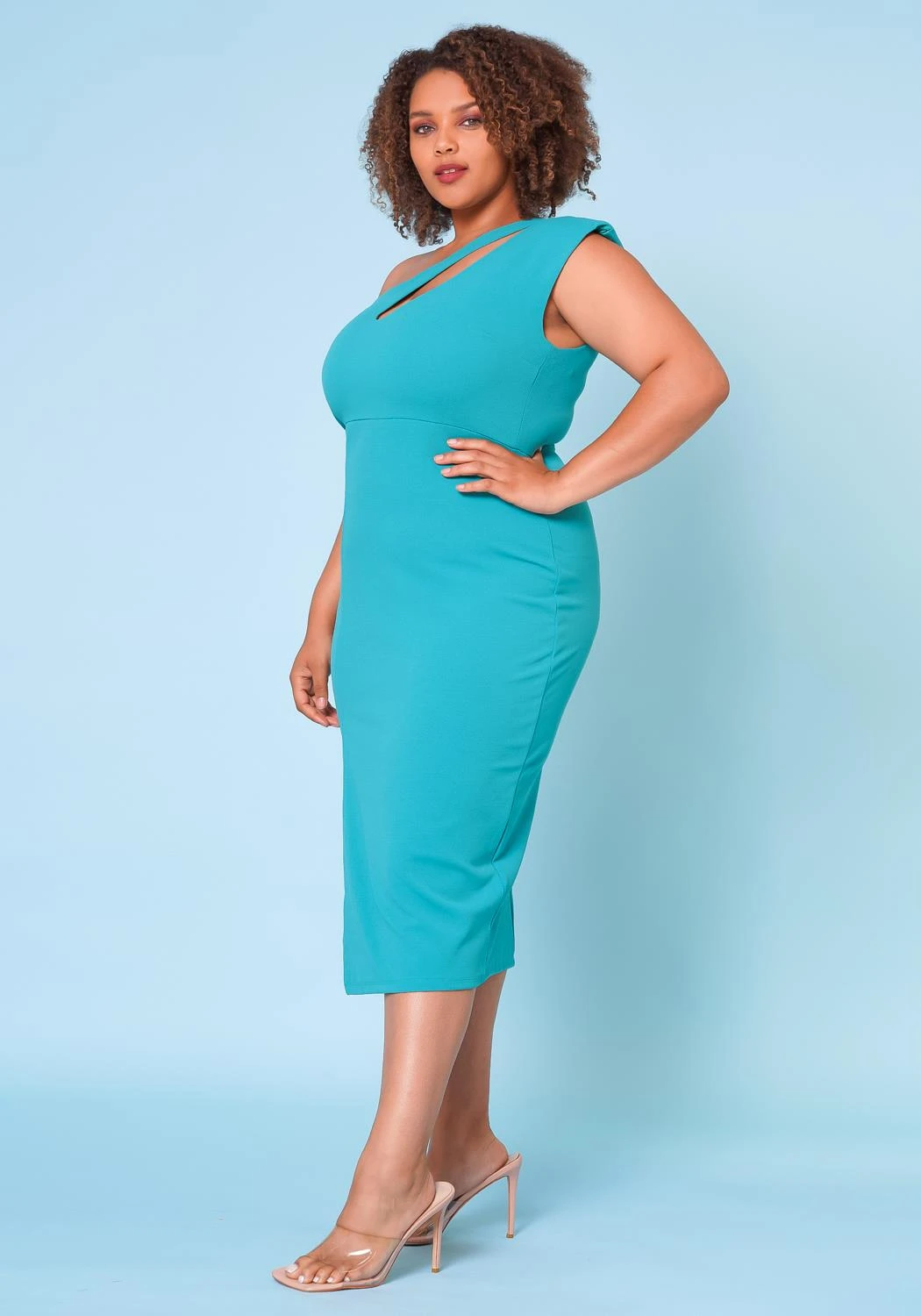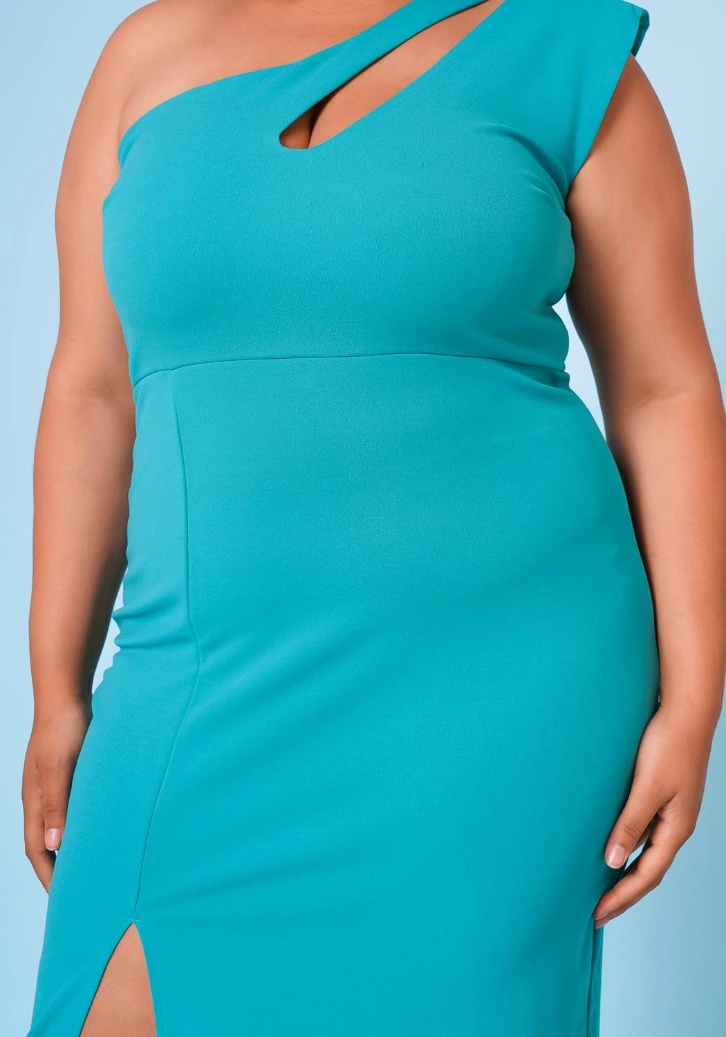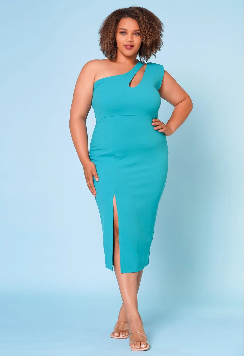 Make an impression in this plus size women’s cocktail midi dress which features an asymmetric one sleeve design, slit hem details and back zipper closure.