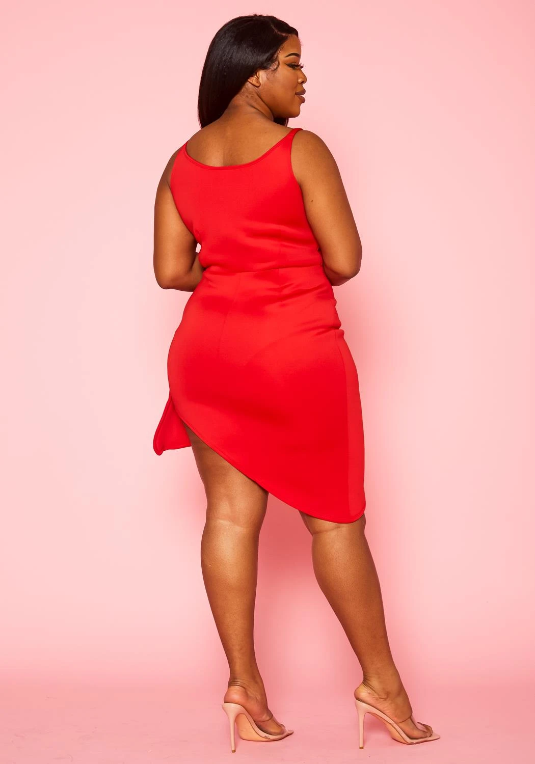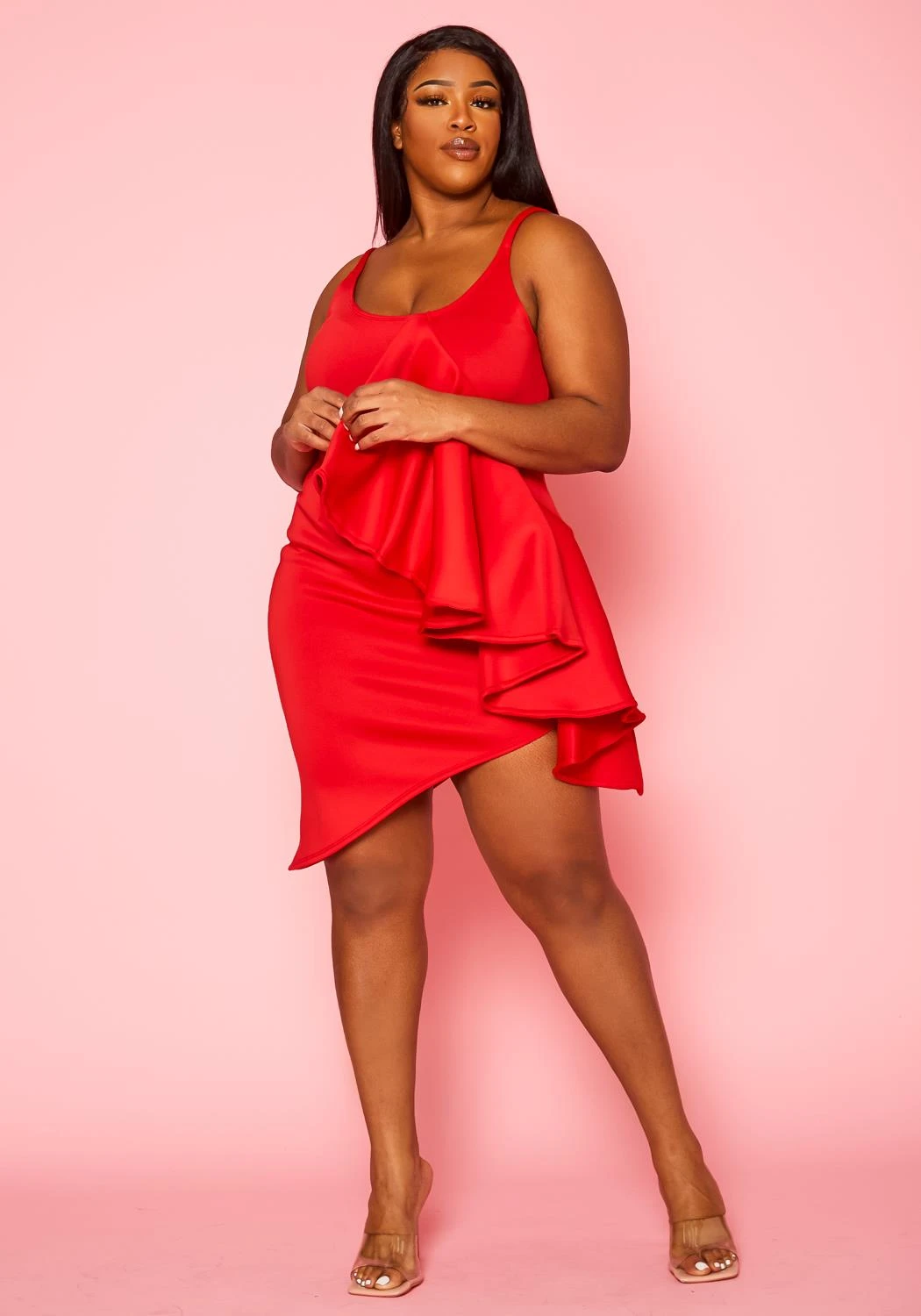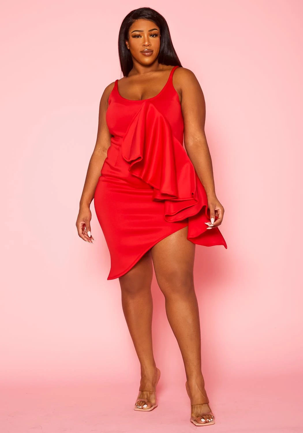 For your fanciest occasion we got you with the perfect dress! Features a asymmetric 360 cut, front ruffle drape ascent, scoop neck and cami shoulder straps.