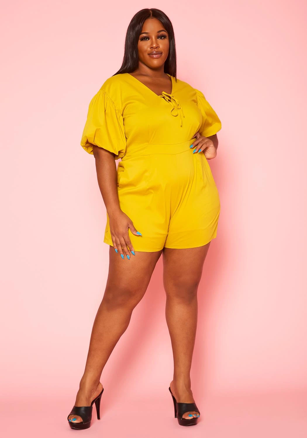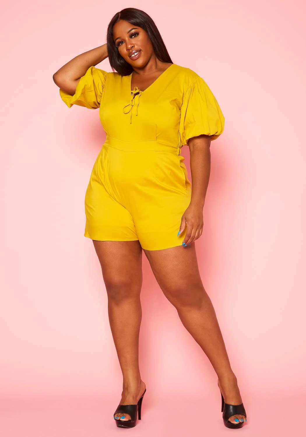 Plus size women’s romper, featuring a v-neck front with tie-up closure detail, short ballon sleeves, elastic waist band, pockets & back button closure.