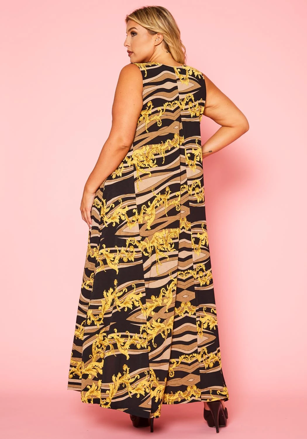 Chic high-low maxi dress, featuring abstract brocade print, sleeveless hem & round neck hem.