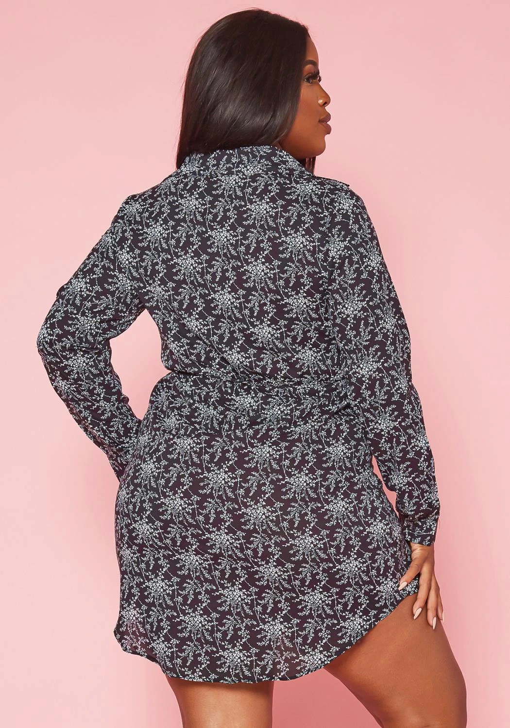 Lovely little black mini dress for brunch and summer dining dates! Features a dainty floral print, collar neck style, button front closure, long sleeves with buttoned wrist cuffs and waist tie ascent.