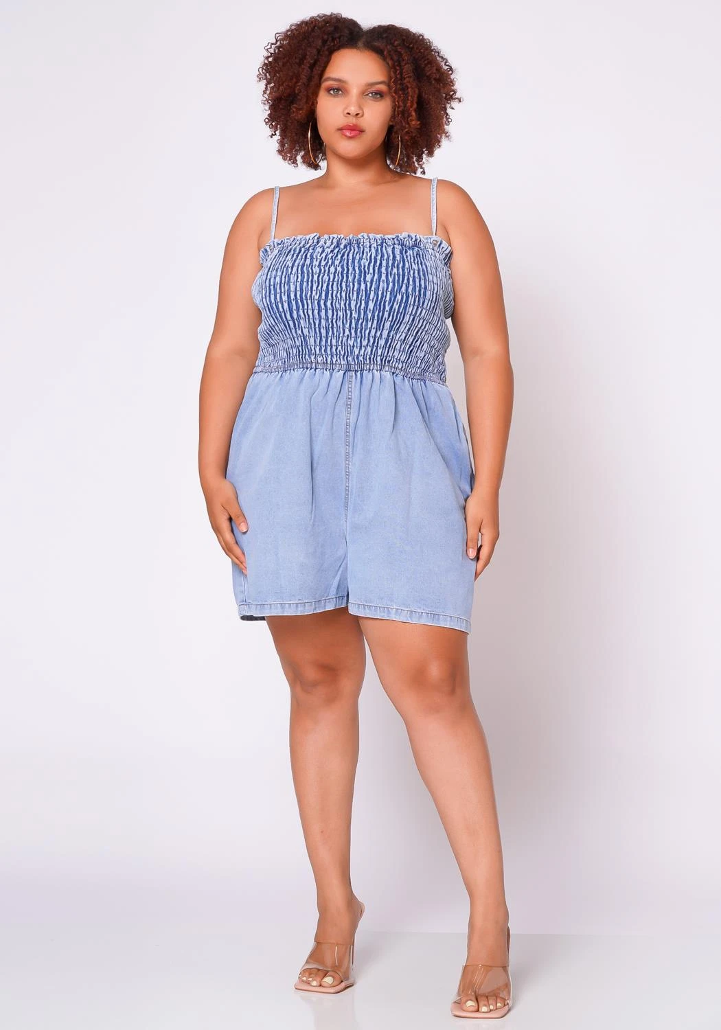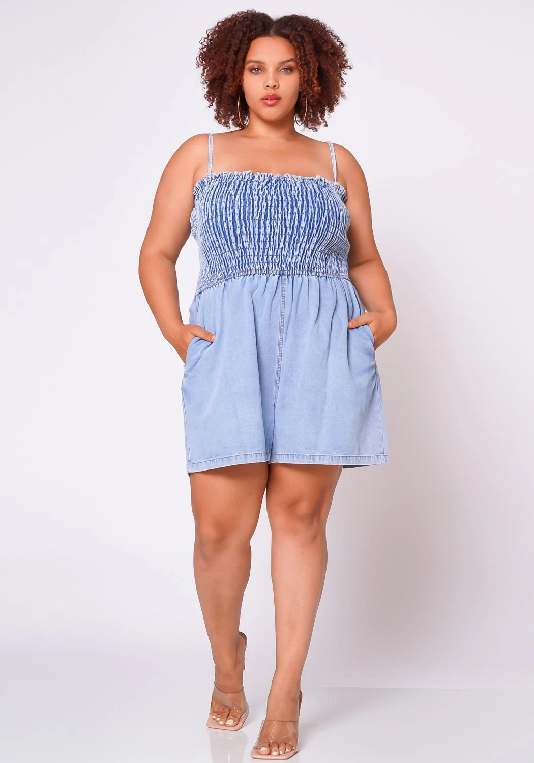 Plus size summer giving light washed short denim romper featuring pocket hem, cami style top with ruched texture detailing.