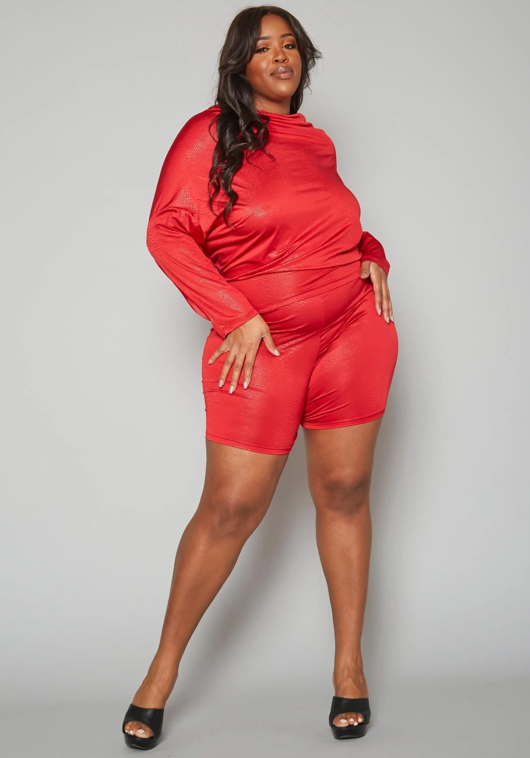 Romantic plus size women’s romper in dolman long sleeve design, open back style, high neck and shimmery material.