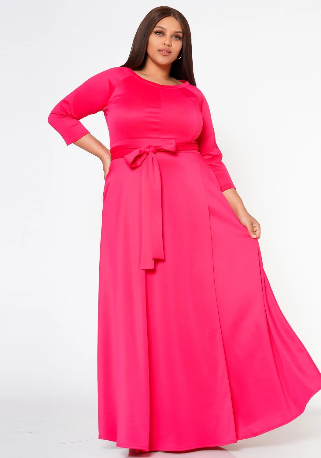 Gorgeous plus size women’s solid color maxi dress. Features fit to flare style, 3/4 fitted long sleeves, round neckline, waist tie ascent and pocket hem.