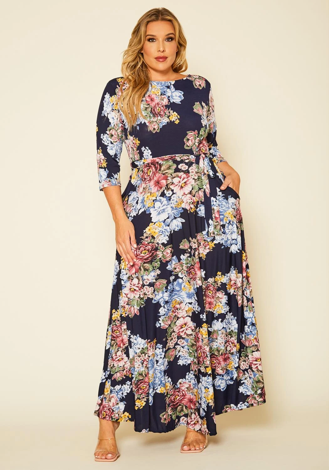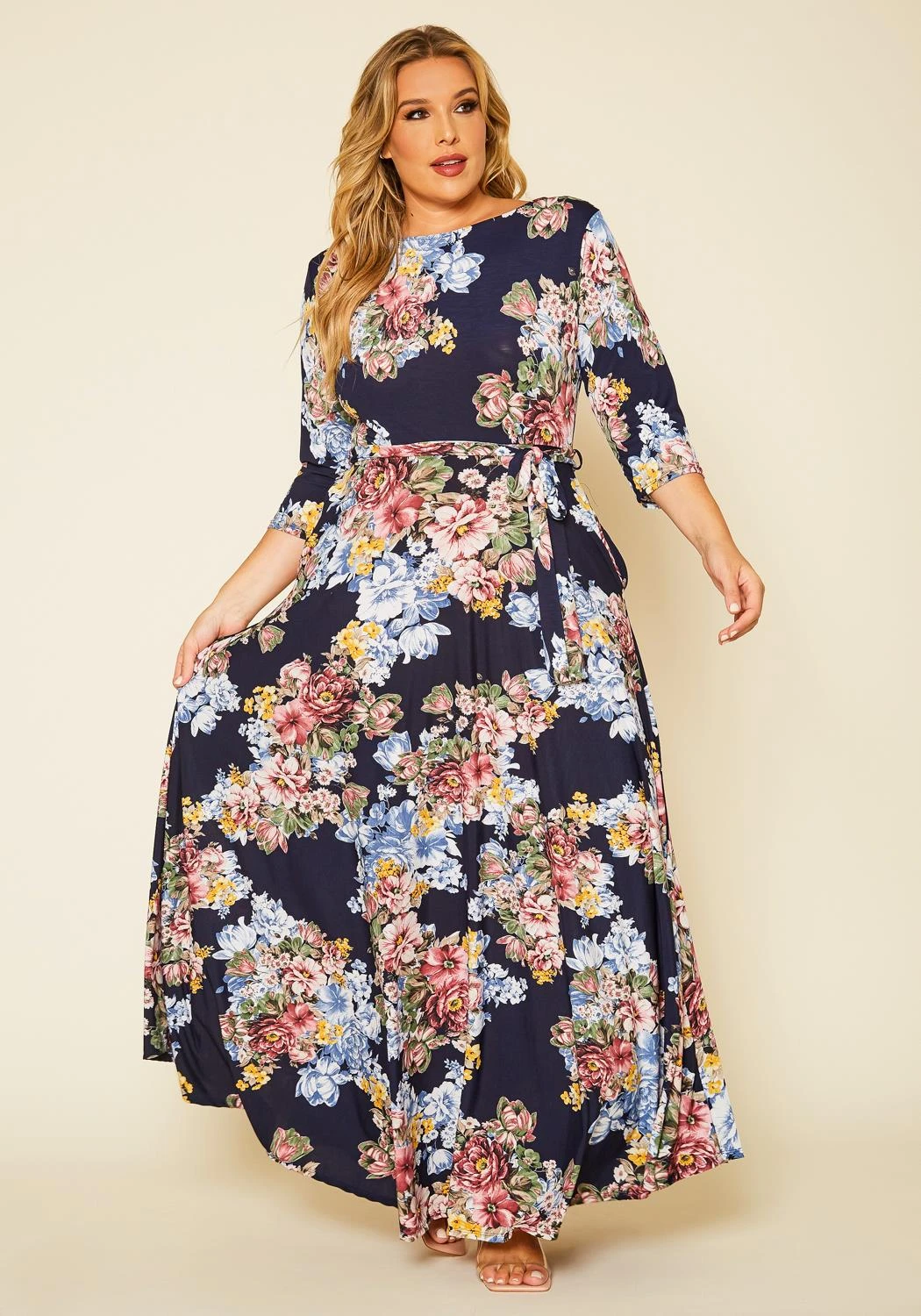 Plus size women’s dress in maxi style, featuring boat neck hem, 3/4 sleeve hem, non-detachable waist tie up detail & side pockets.