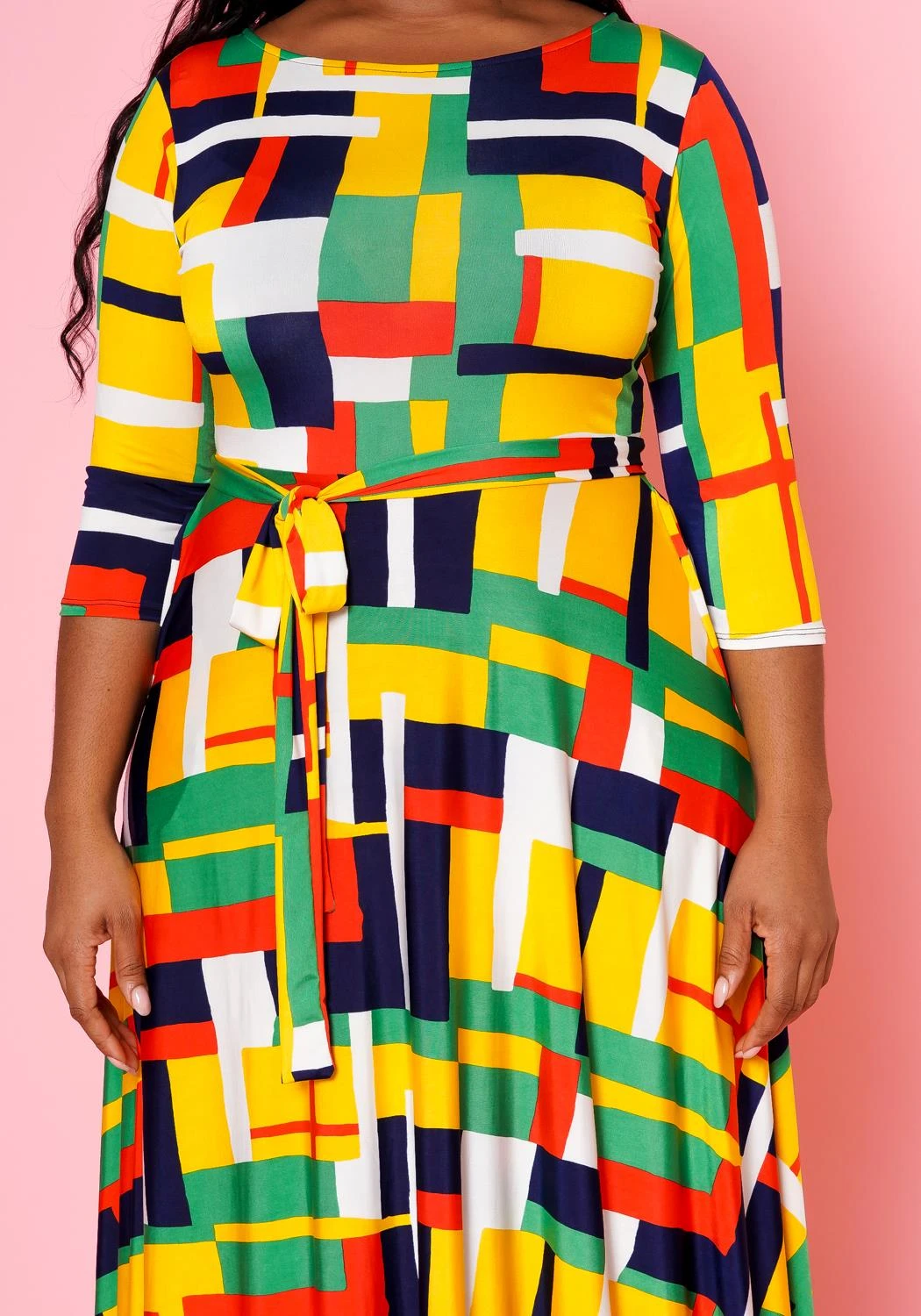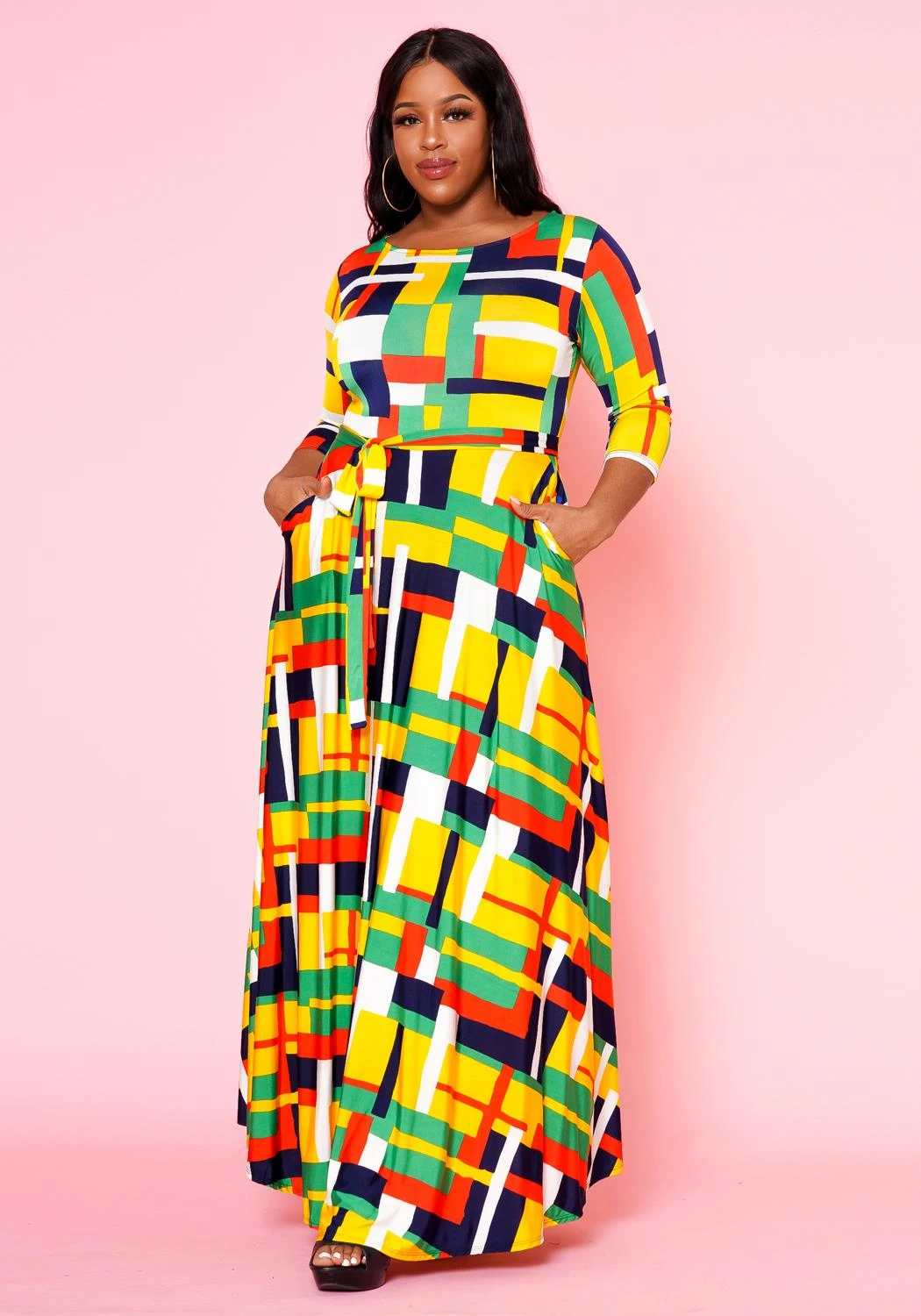 Lovely plus size women’s fit to flare maxi dress with geometric pattern, 3/4 fitted long sleeves, pocket hem and waist tie ascent.