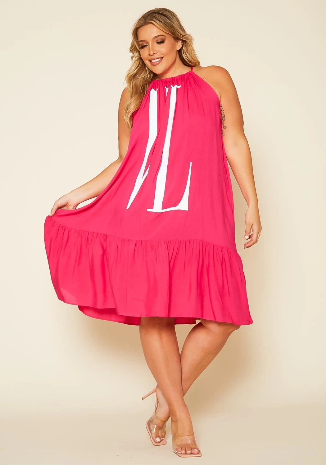 Plus size women’s dress in halter style, featuring a graphic front and back detail ” VL”, tiered hem & drawstring tie up closure.