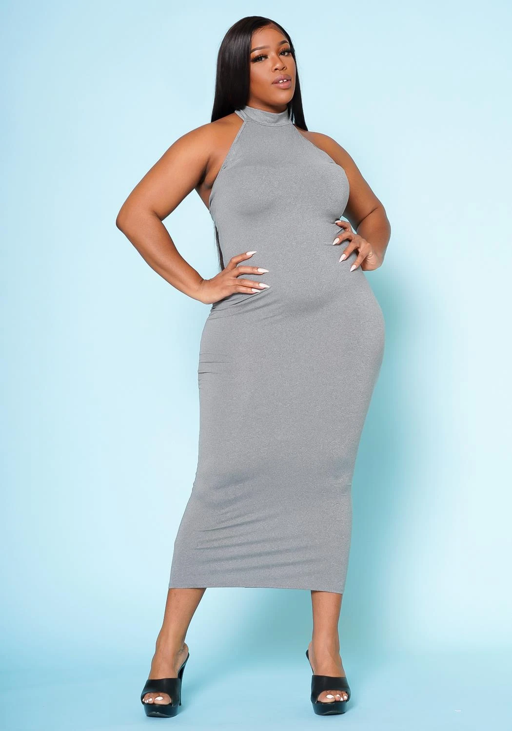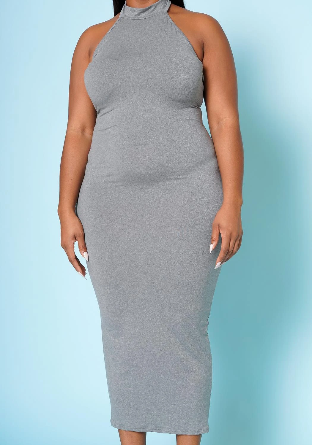 Effortless plus size women’s bodycon midi dress in halter neck design, neck button closure and soft-body hugging material.