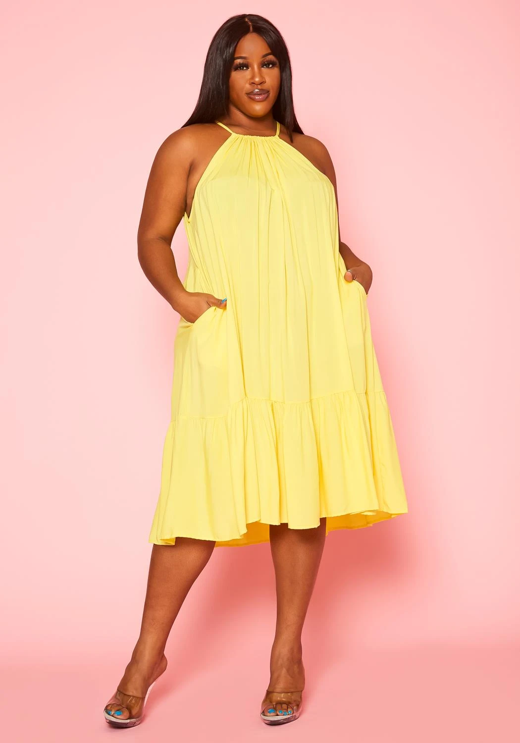 Plus size women’s dress in halter style, featuring tiered hem, side pockets & drawstring tie up closure.