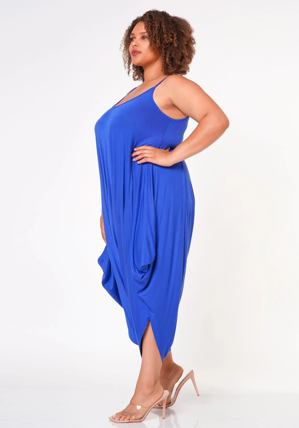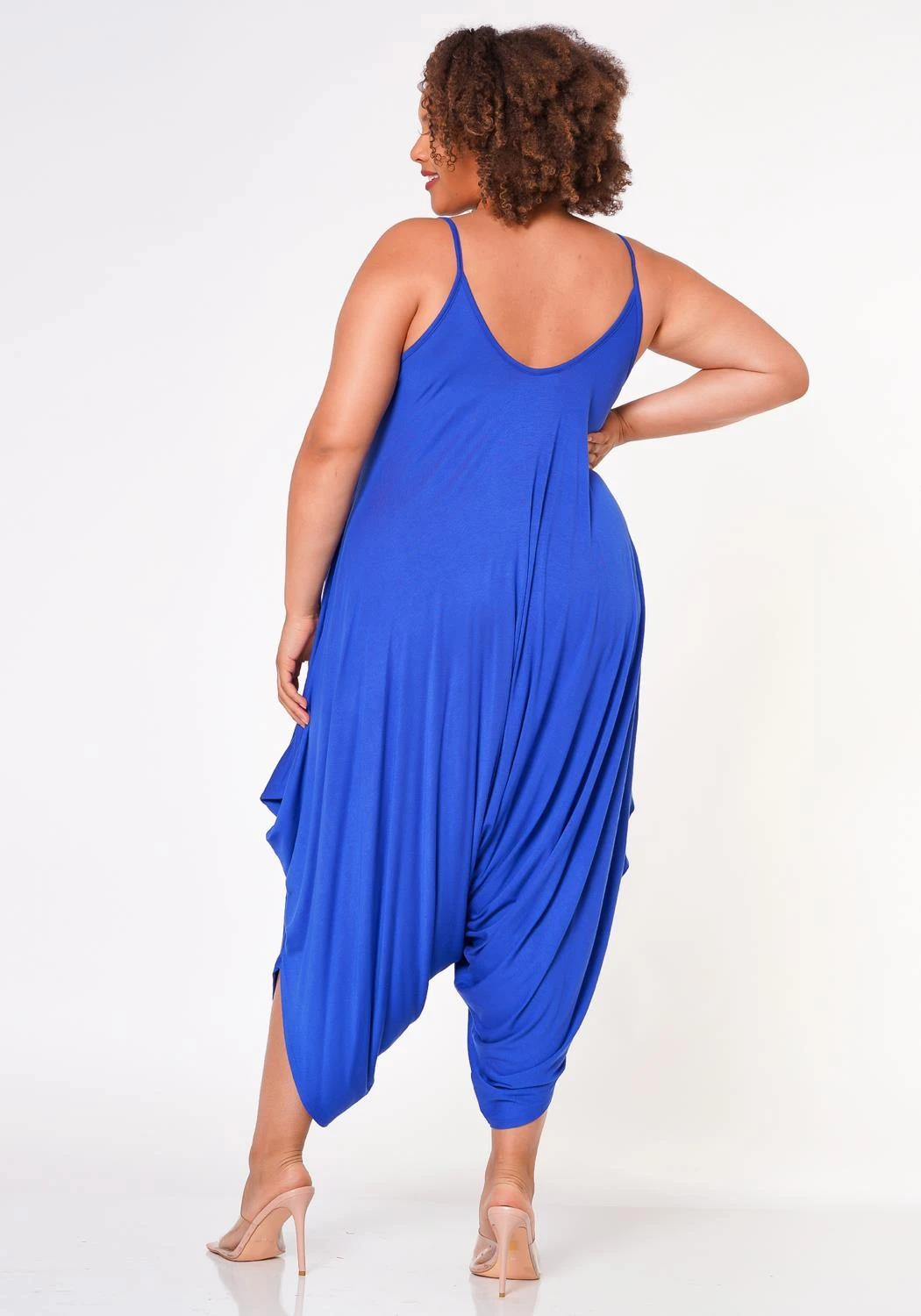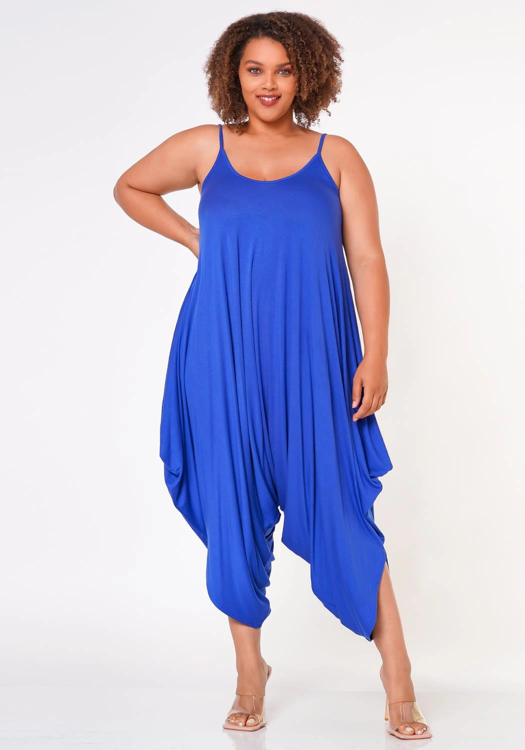 Lounge essential cami jumpsuit for plus size women in harem design, cami shoulder straps, U-neckline, capri length and relaxed fitting.