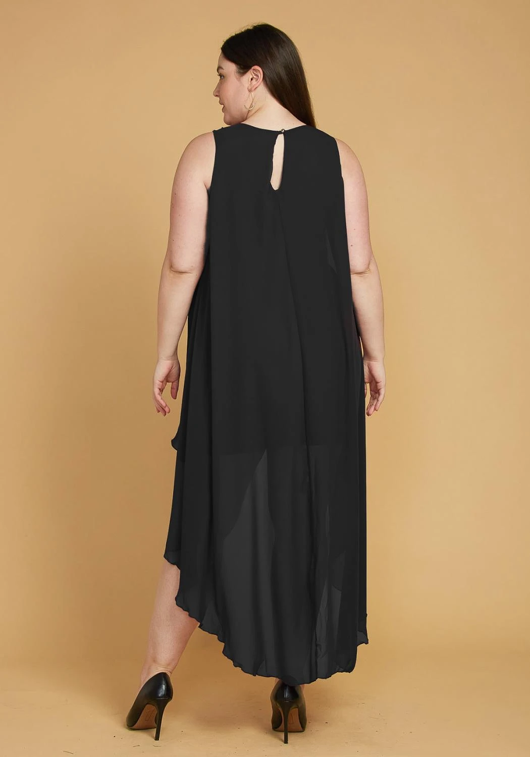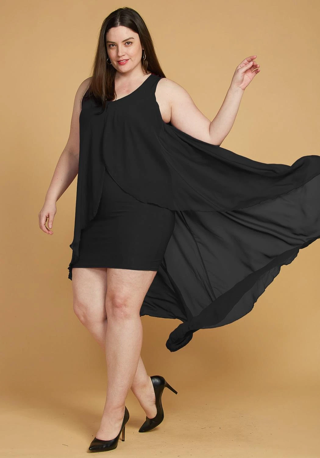 Dramatic chiffon cape dress, perfect for a party. Add some earrings, clutch, and heels and you’re all set.