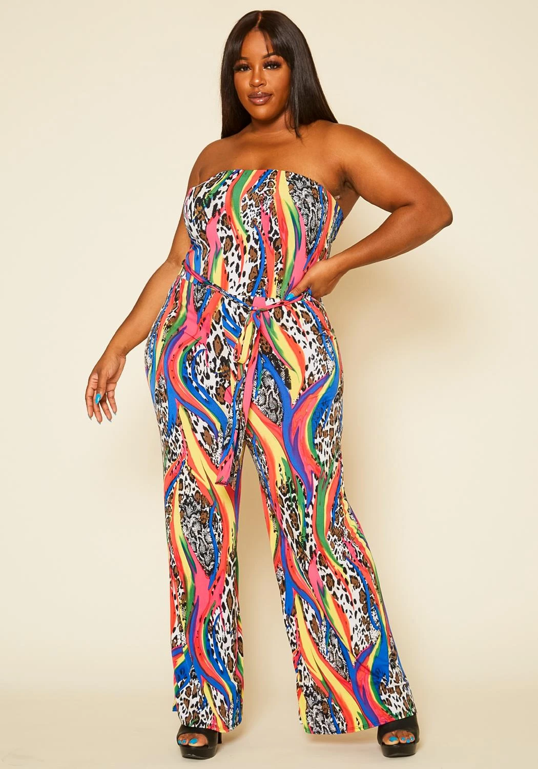 One of a kind plus size women’s jumpsuit with leopard pattern, colorful print mix, belted waist tie, flare leg hem and tube fitting.