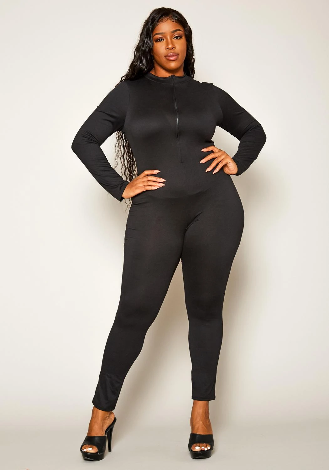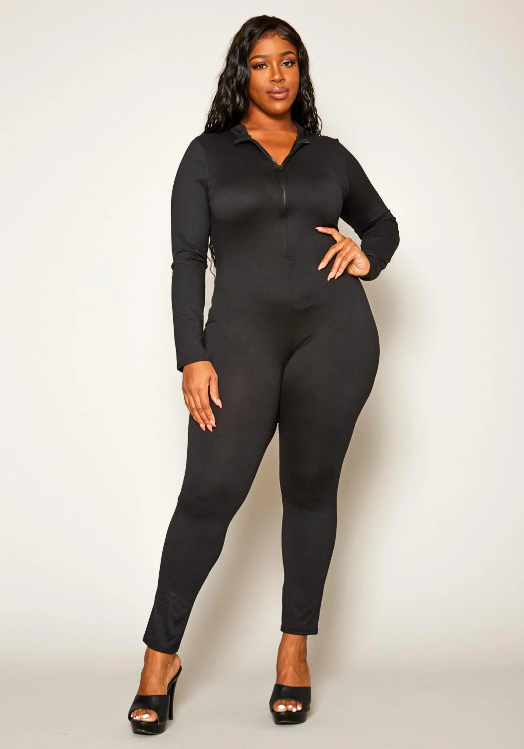 Basic plus size women’s jumpsuit in mock neck style, zipper front hem, long sleeves and butter soft fabric.
