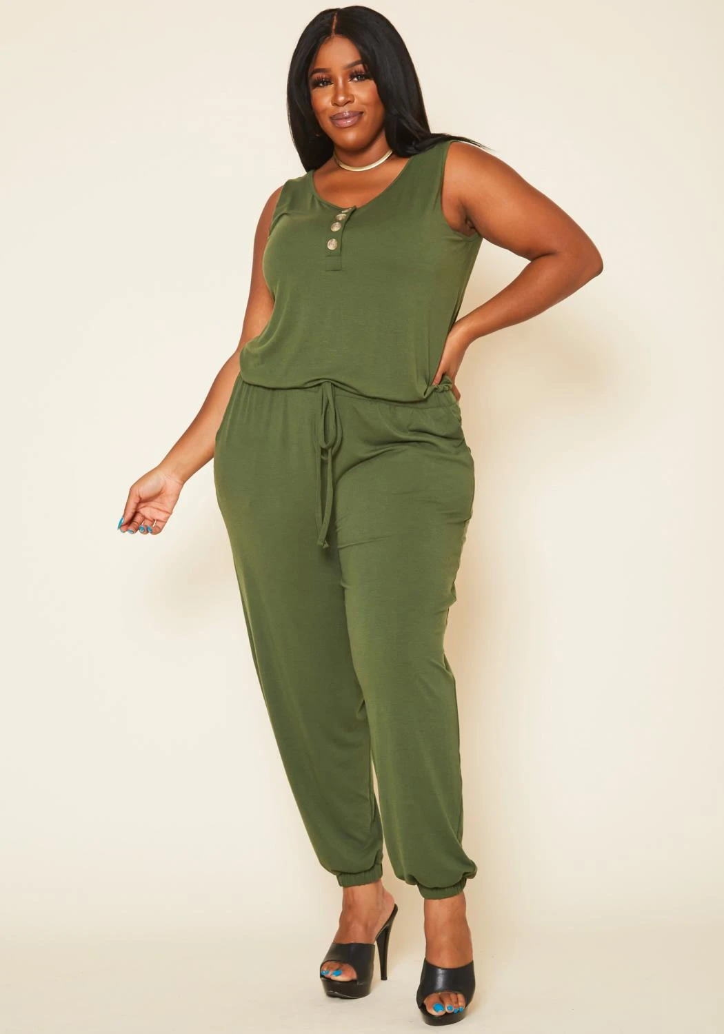 Plus size women’s jumpsuit in sleeveless style featuring round neck ascent, front button closure detail, elastic waistband ascent and drawstring detail.