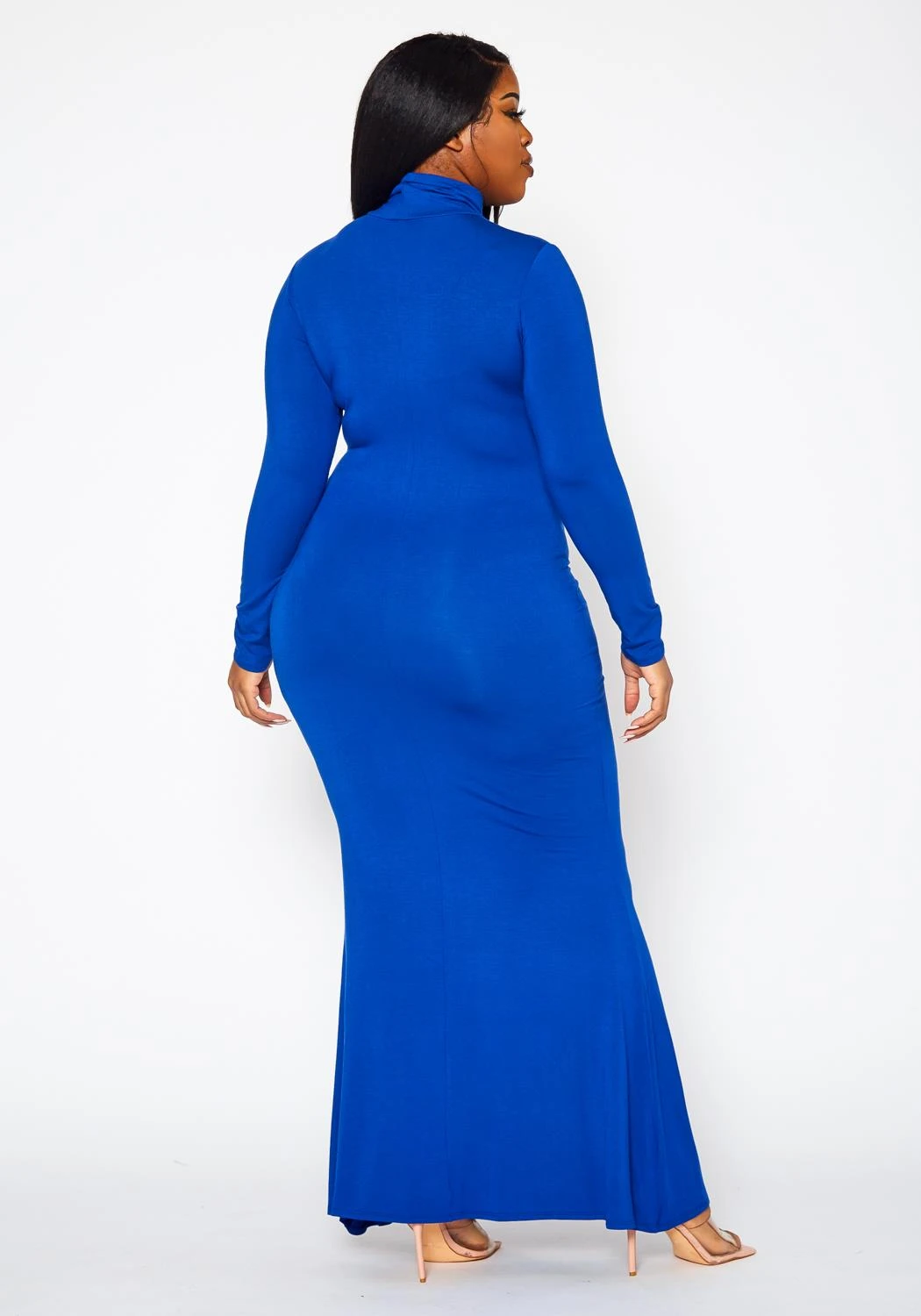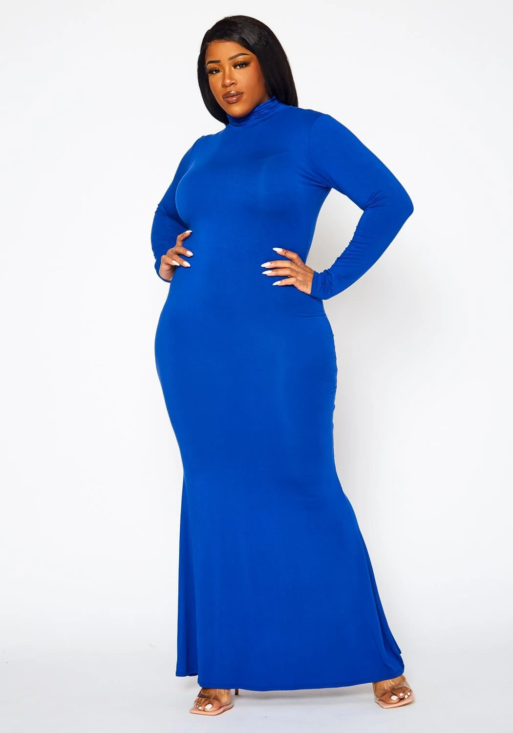 Simply effortless plus size women’s maxi dress with mermaid flare hem, fitted long sleeves and mock neck style.