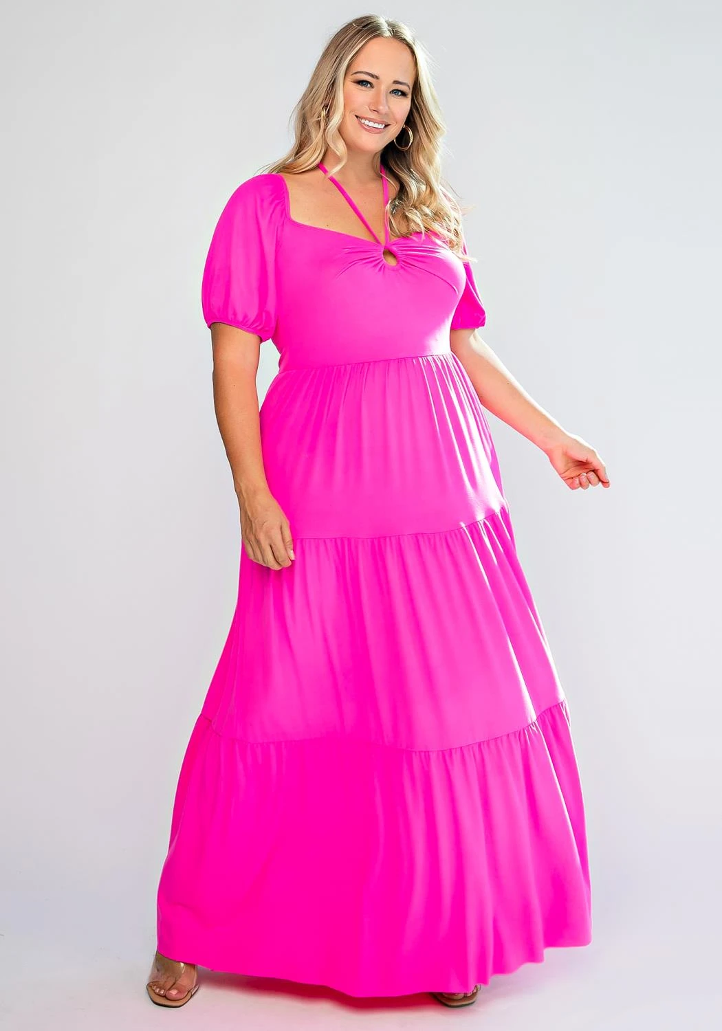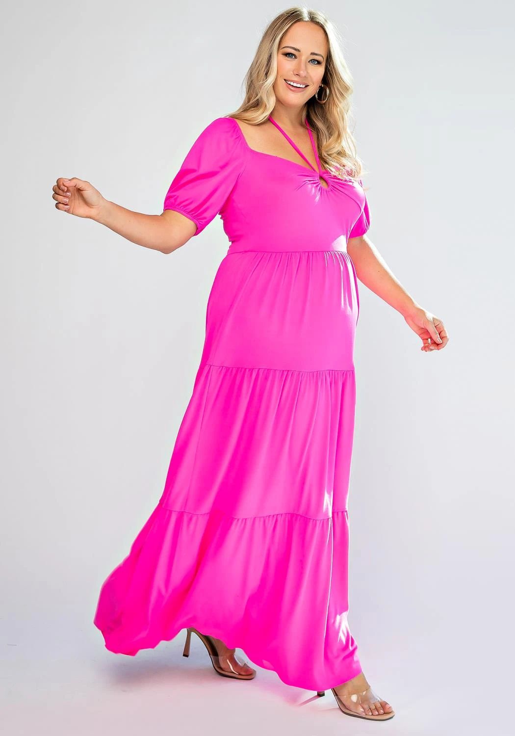 Gorgeous plus size women’s fit to flare maxi dress in off shoulder design, short sleeves, button front lining and bow tie ascent.