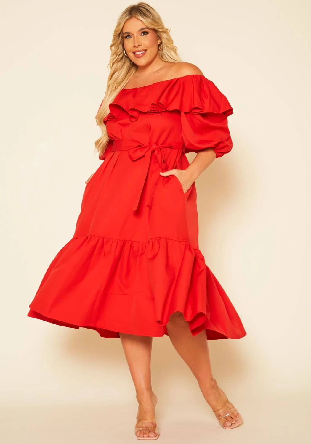 Romantic plus size women’s midi dress features an off shoulder style, half puff sleeves, waist tie ascent and wide flare design.