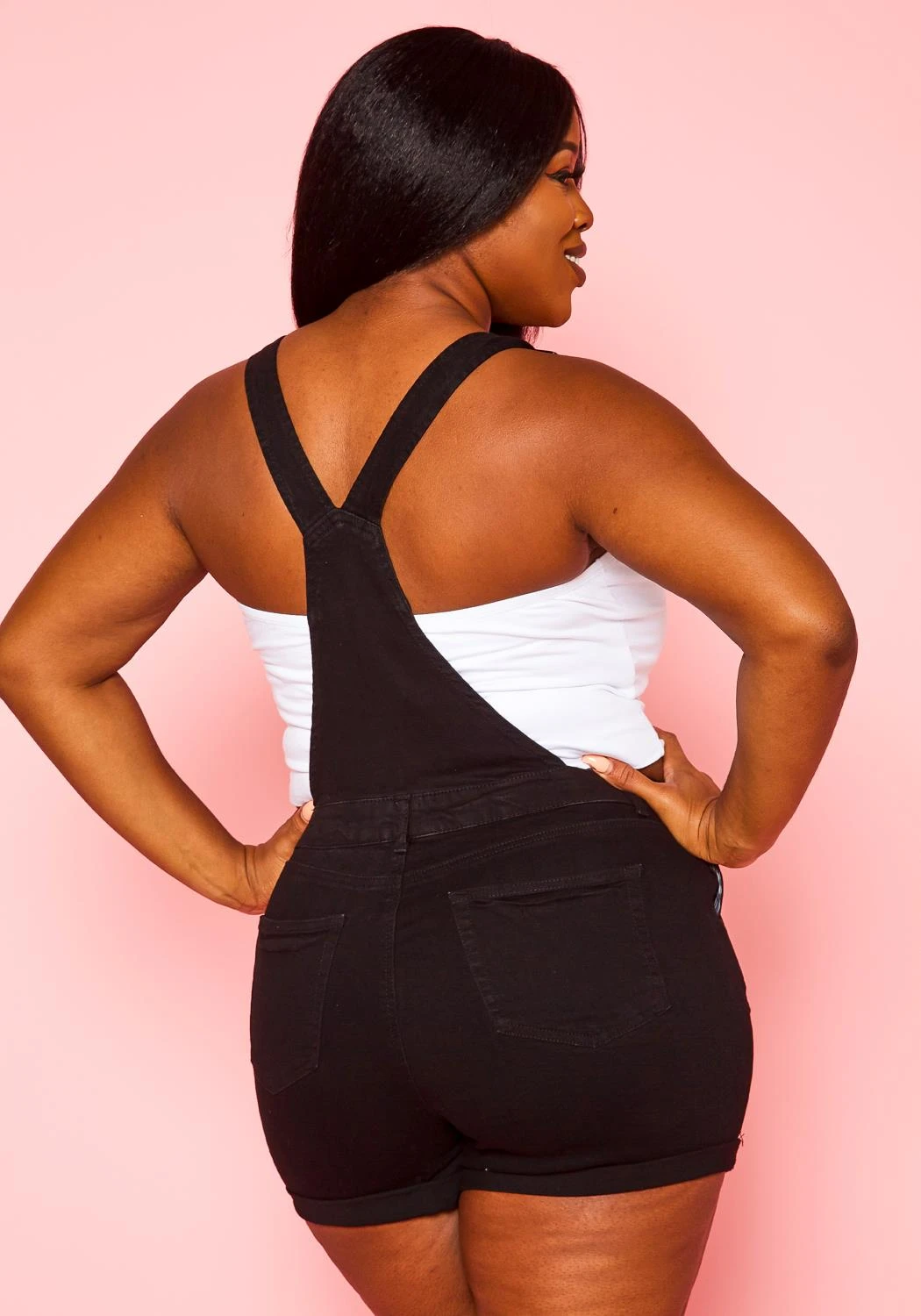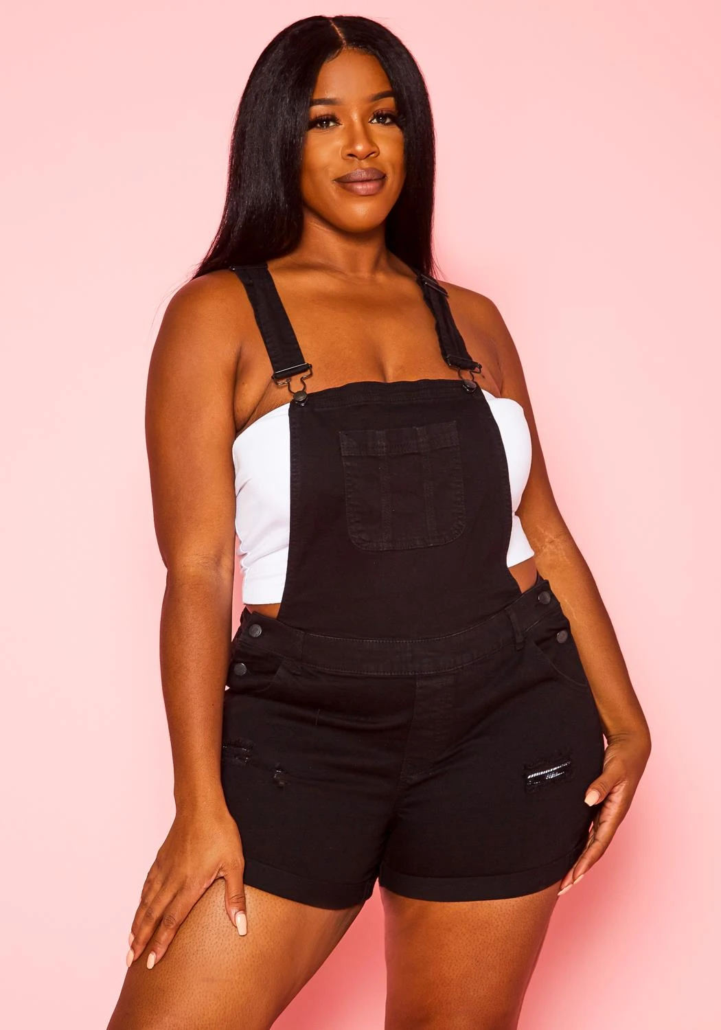 Cute and casual overall denim shorts with belt loop holes, button closure and distressed hem.