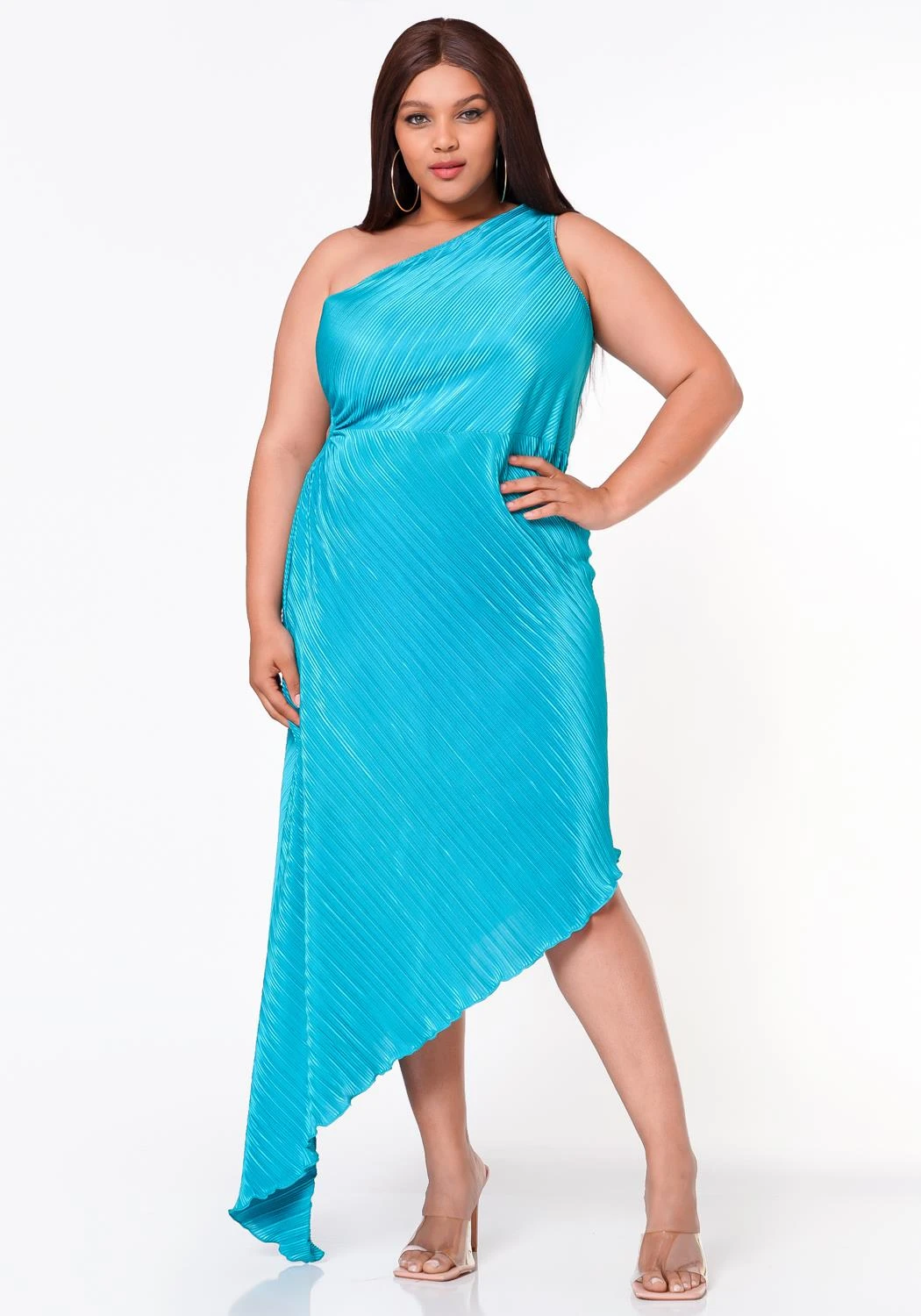 Mesmerizing asymmetric hem dress for plus size women which features a one sleeve design, pleated material and side keyhole cut out ascent.