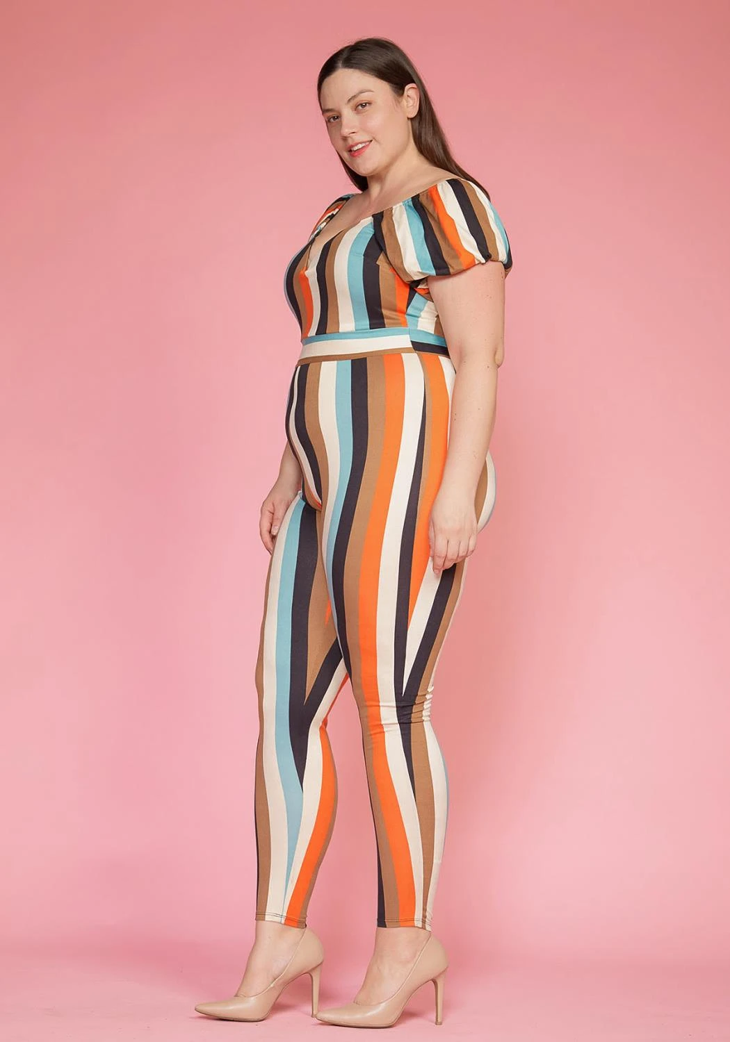 Plus size women’s multi striped jumpsuit in off shoulder style, puffy short sleeve and wired v-slit hem.