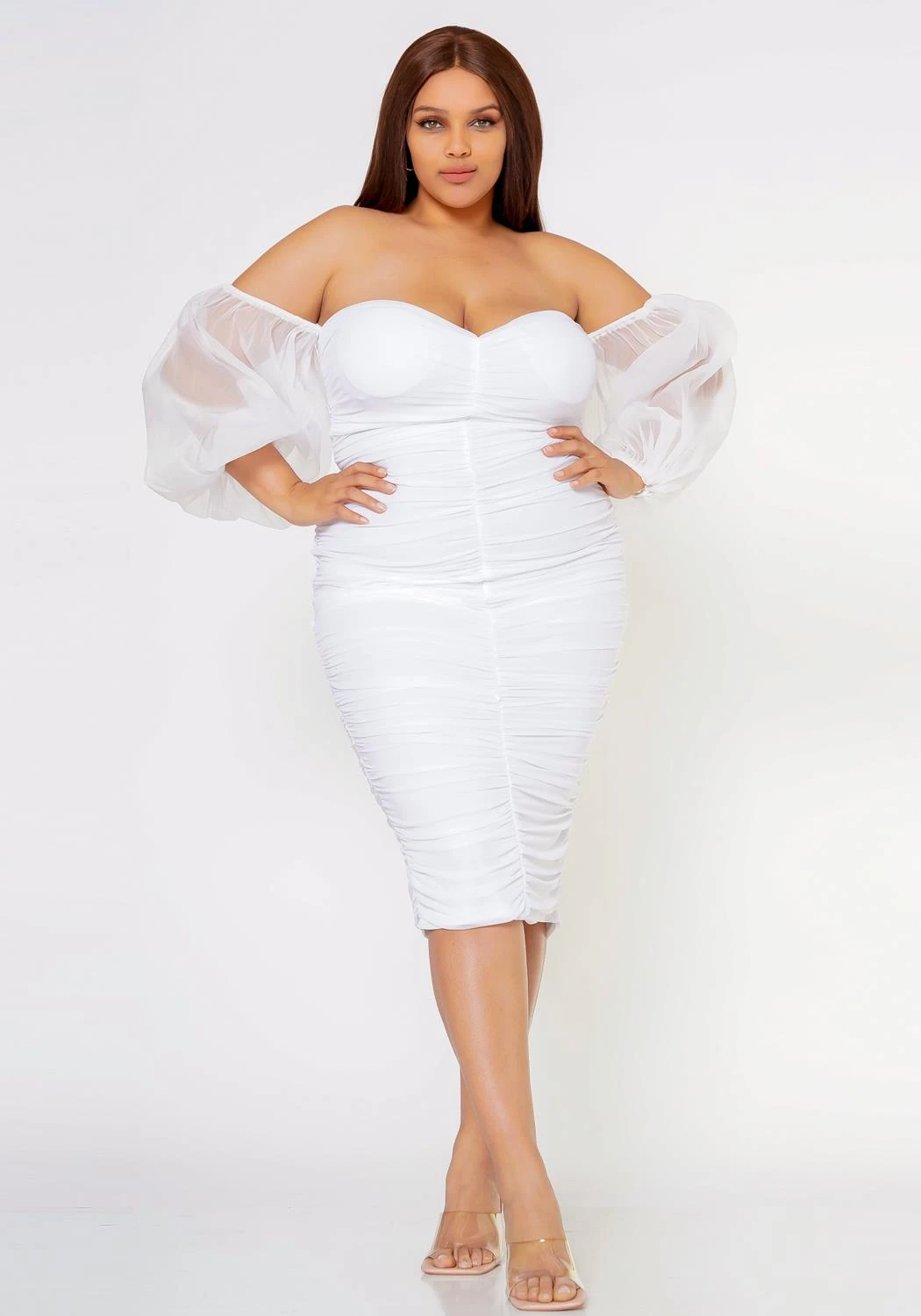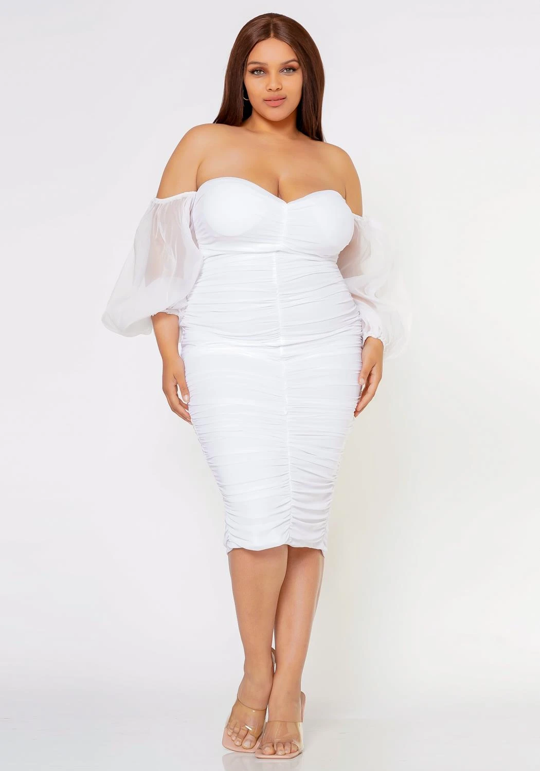 Let the compliments roll in this romantic midi dress for plus size women. Features an off shoulder style, ruched hem, puffy sheer sleeves and bottom lining.