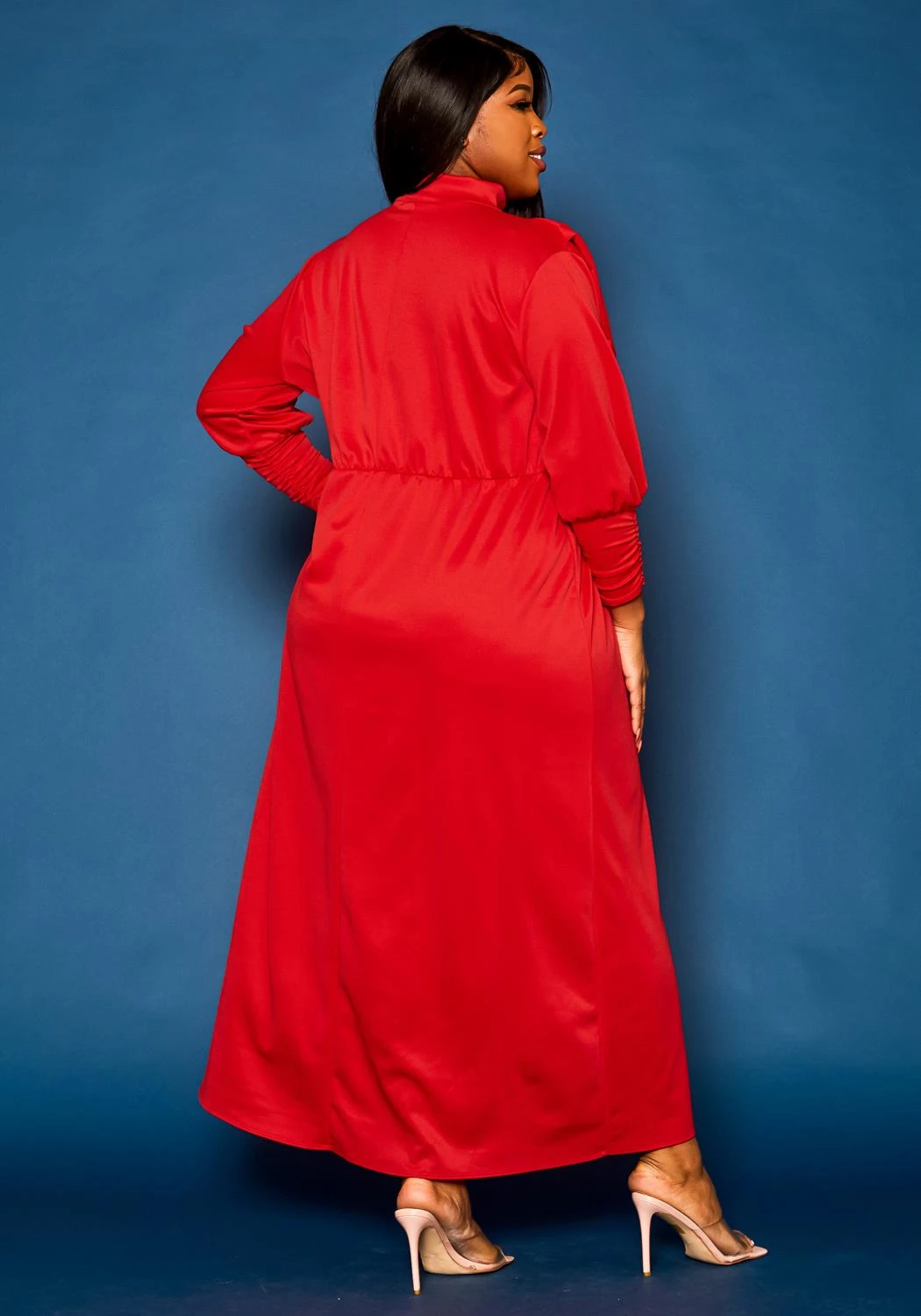 Effortless maxi dress for plus size women with ruched detailing, high neck style, long sleeves and fit to flare design.