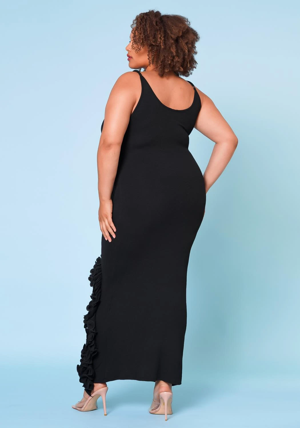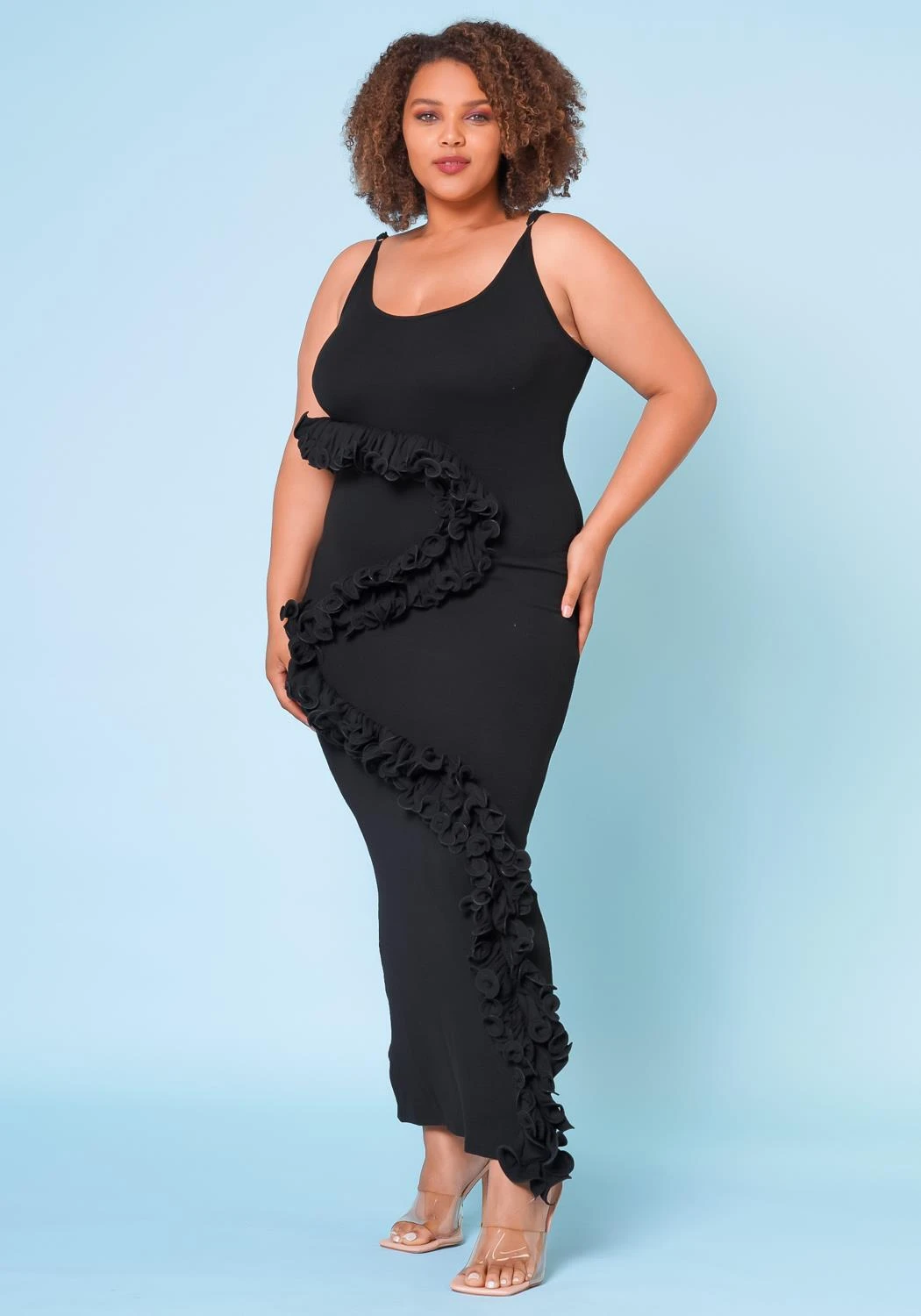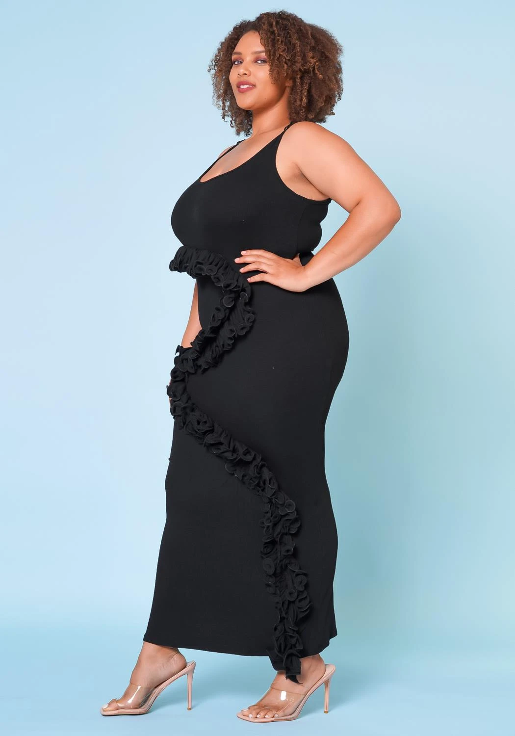 Flawless plus size women’s bodycon dress in ribbed knit material, adjustable shoulder straps, U-neckline, maxi length and ruffle trim detail.