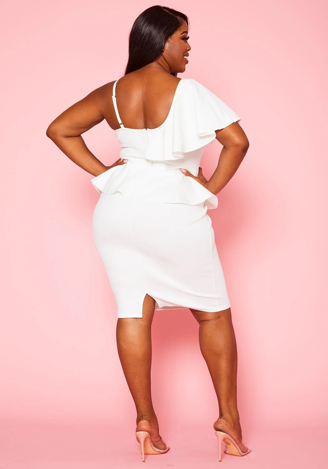 Plus size women’s mini dress in ruffle hem design, v-neck style, cami shoulder strap and bodycon fitting.